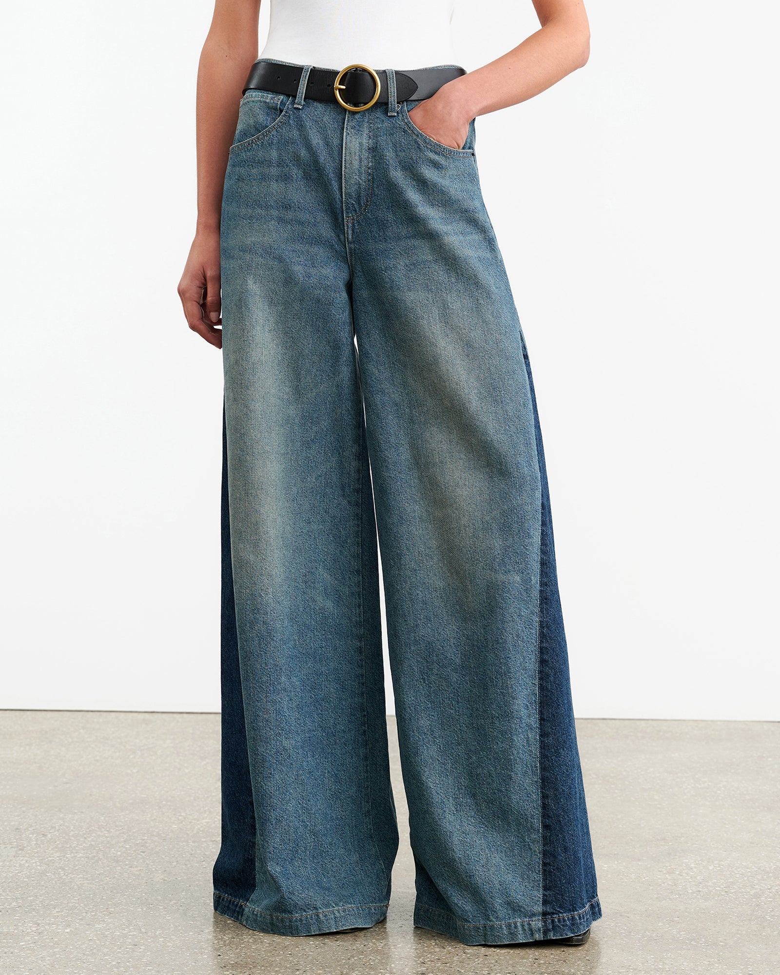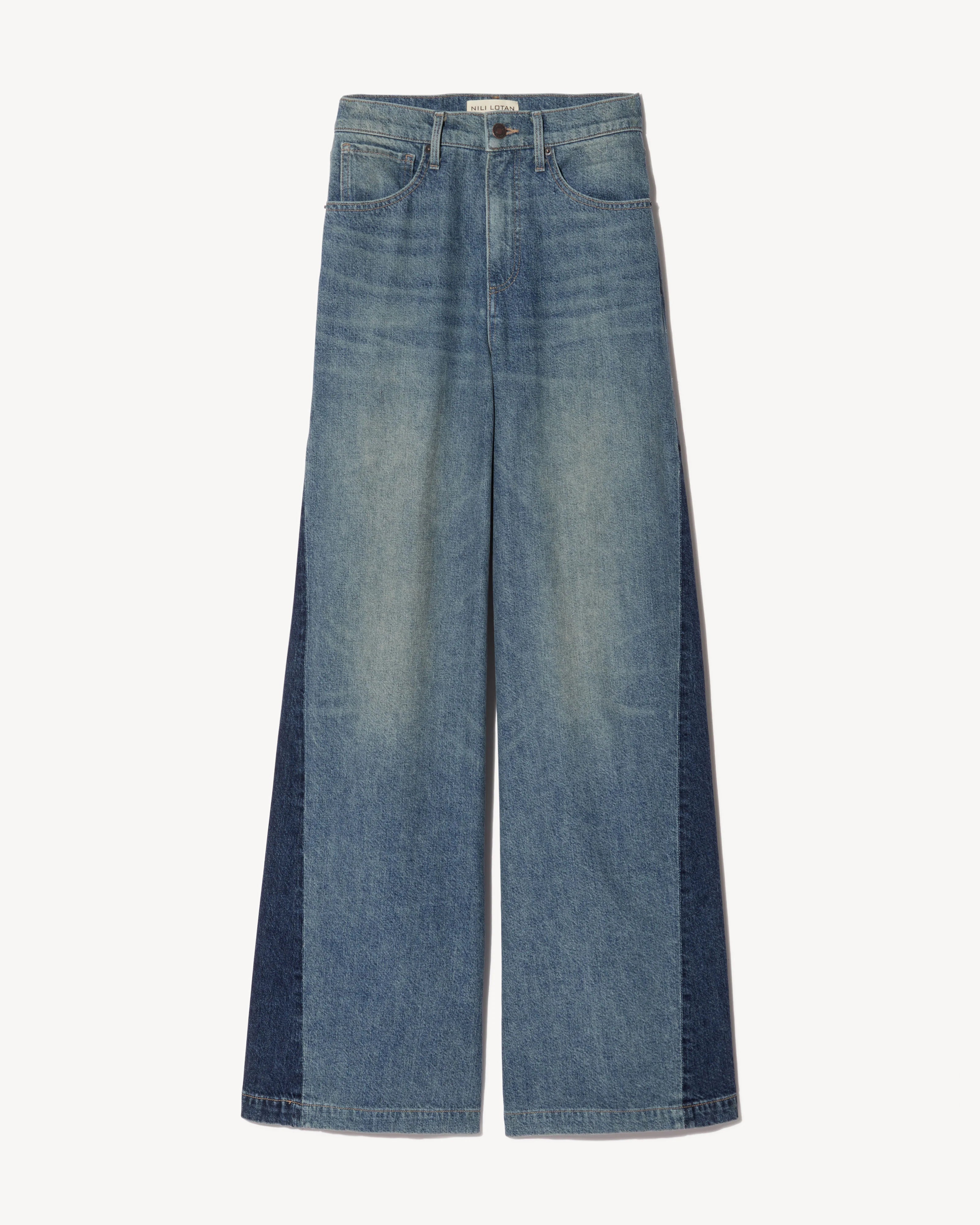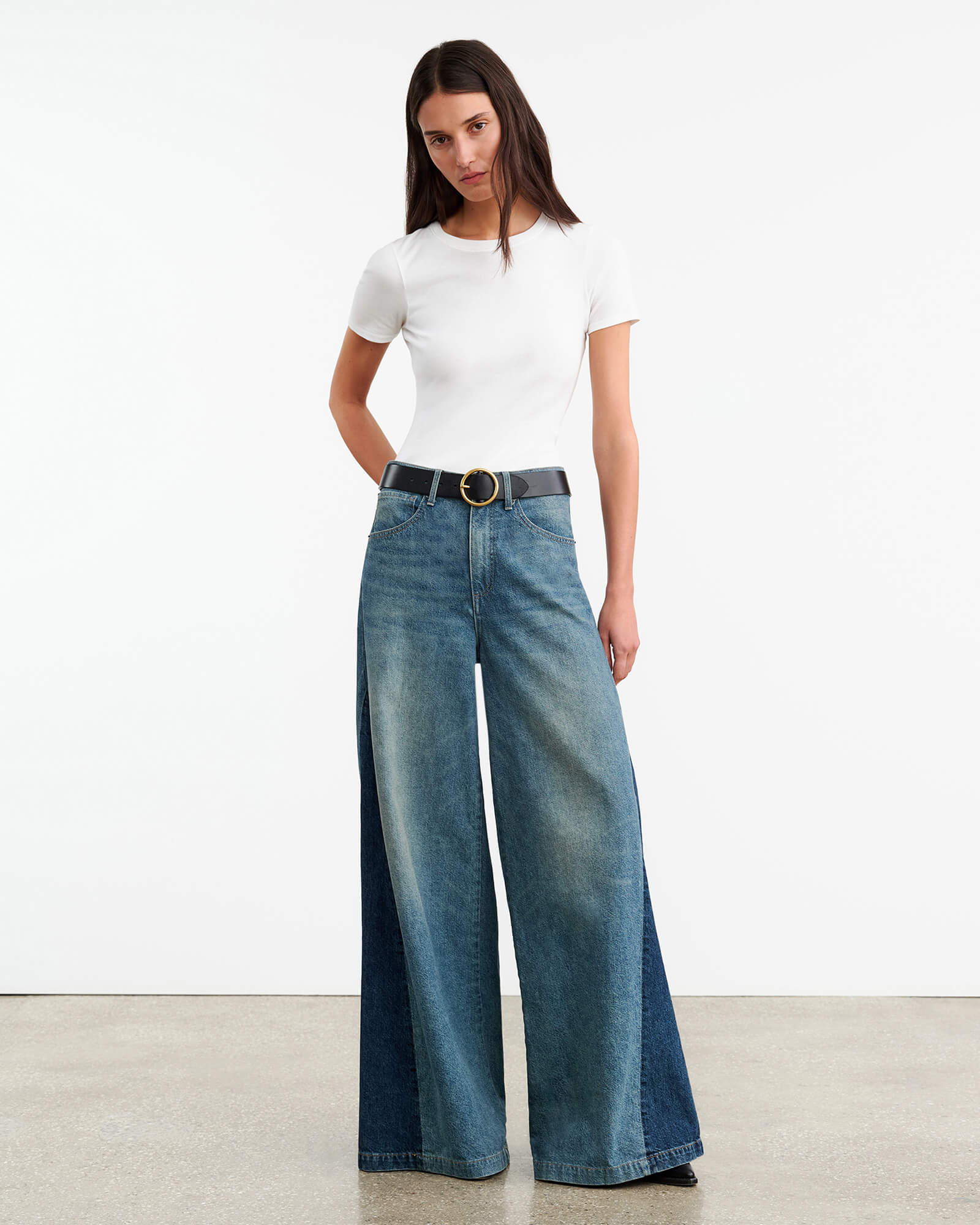 Mid-rise wide flare leg jean in Japanese denim. Patchwork insert. Five pocket detail. Zip fly. Shank closure. Belt loops.
