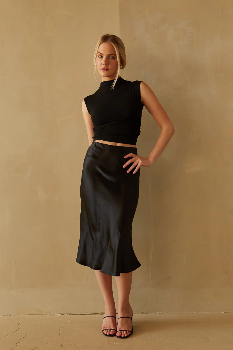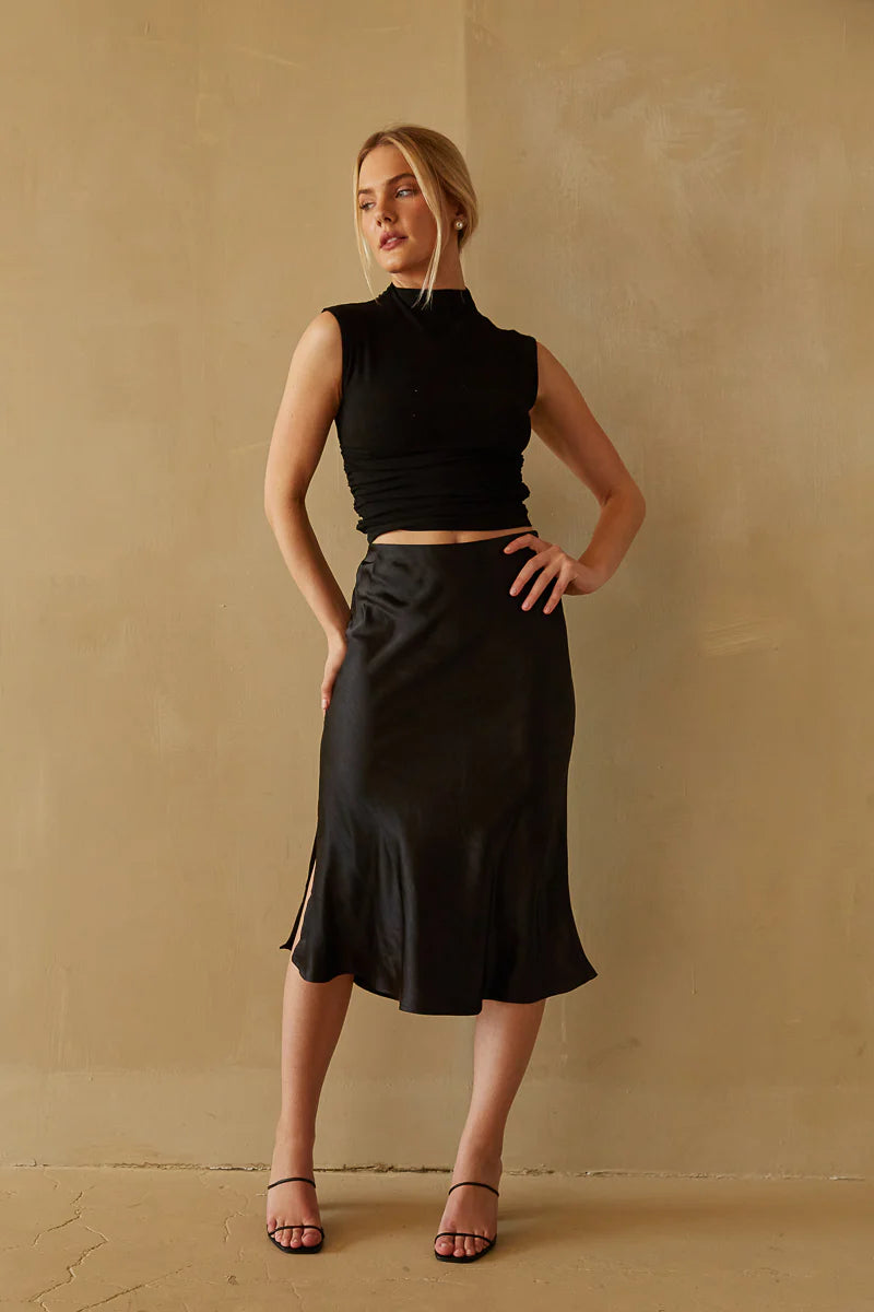 Oh so chic in the Eliza Satin Midi Skirt! Featuring a high rise fit, a relaxed silhouette, and a deep side slit for a glimpse of leg. Available in baby blue and black. Pair with a cute to finish off the look!