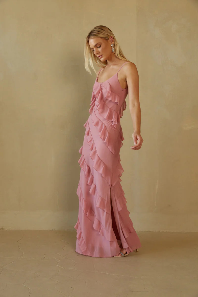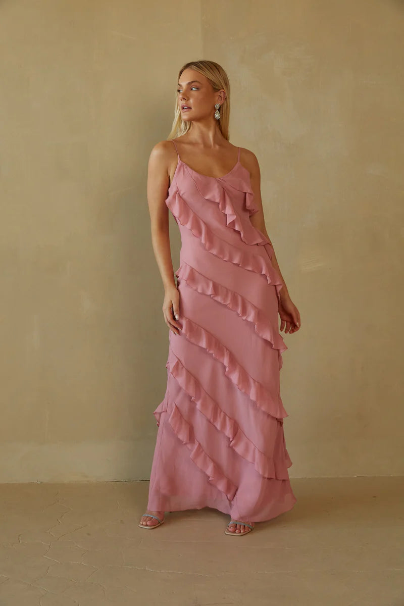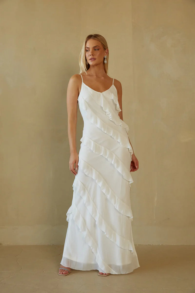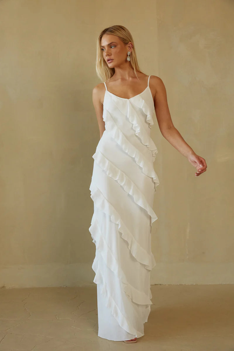 Embrace your femininity in the Elizabeth Tiered Ruffle Maxi Dress! This stunning dress features a V-neckline, asymmetrical tiered ruffles, adjustable spaghetti straps, and a side leg slit. Available in white, blue, and dusty rose. Pair with a simple to complete the look!