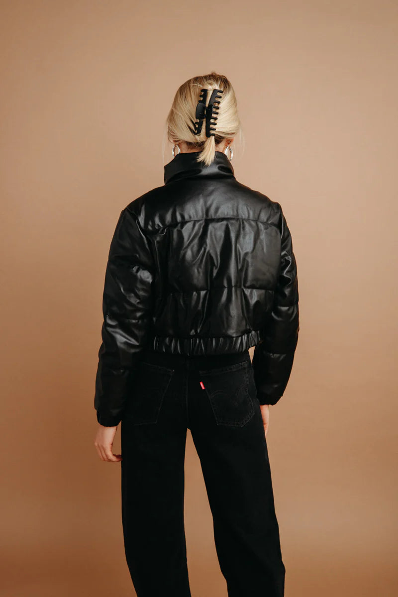 The Ellis Faux Leather Puffer Jacket is a cold weather essential! This trendy jacket features a high neck collar, cropped fit, elastic waistband, and a front zipper. Available in black and ivory. Pair with the to complete the look!