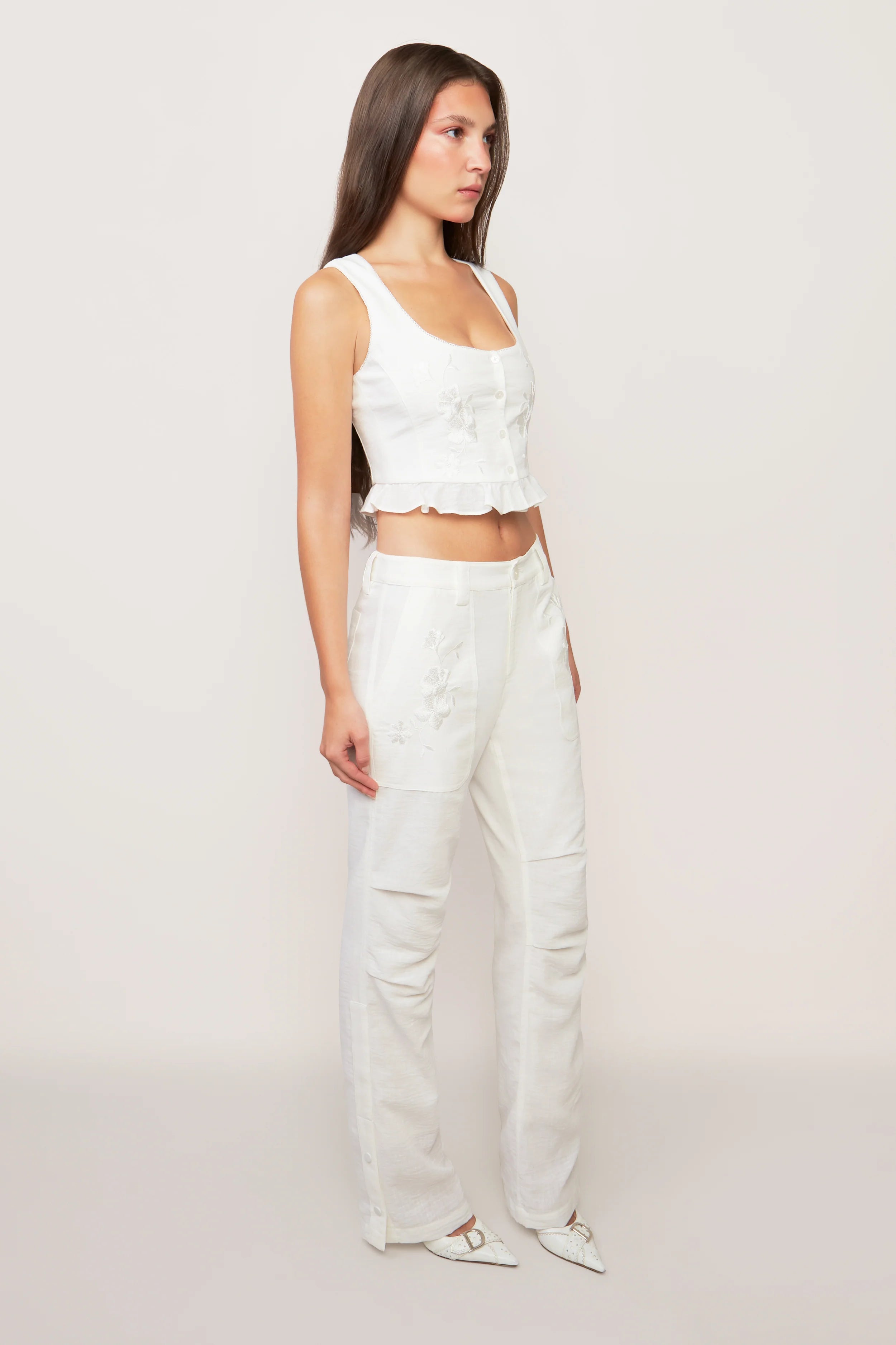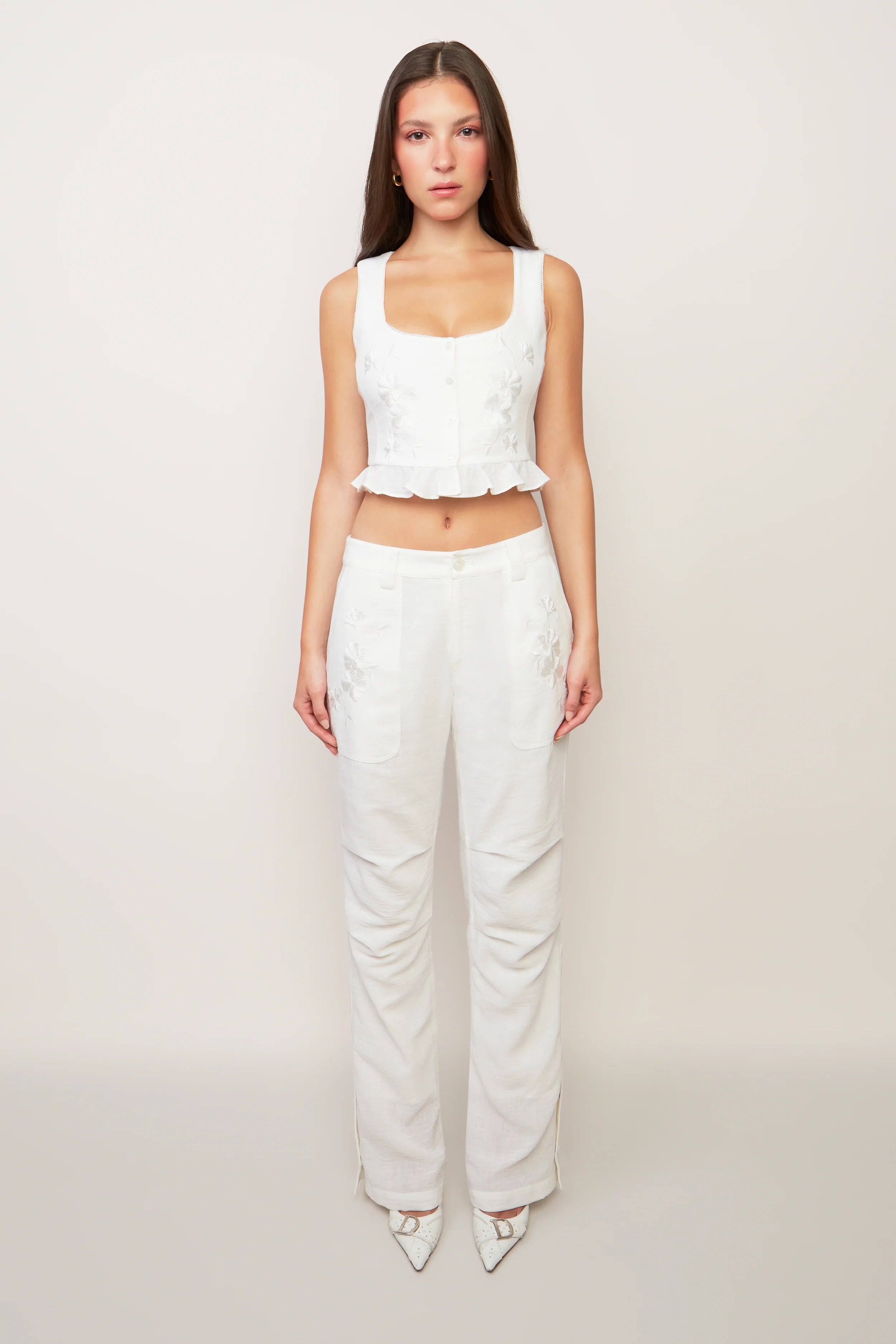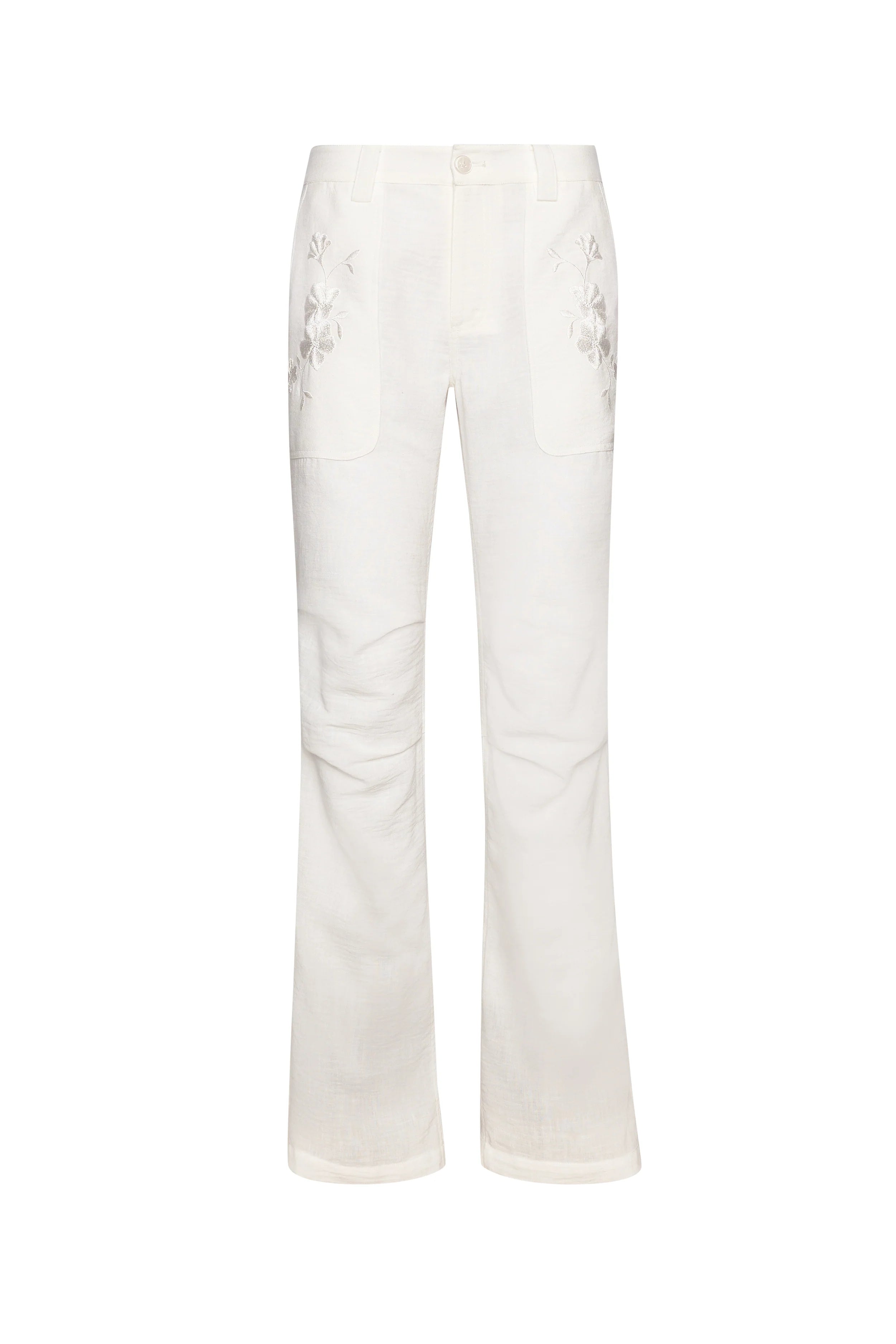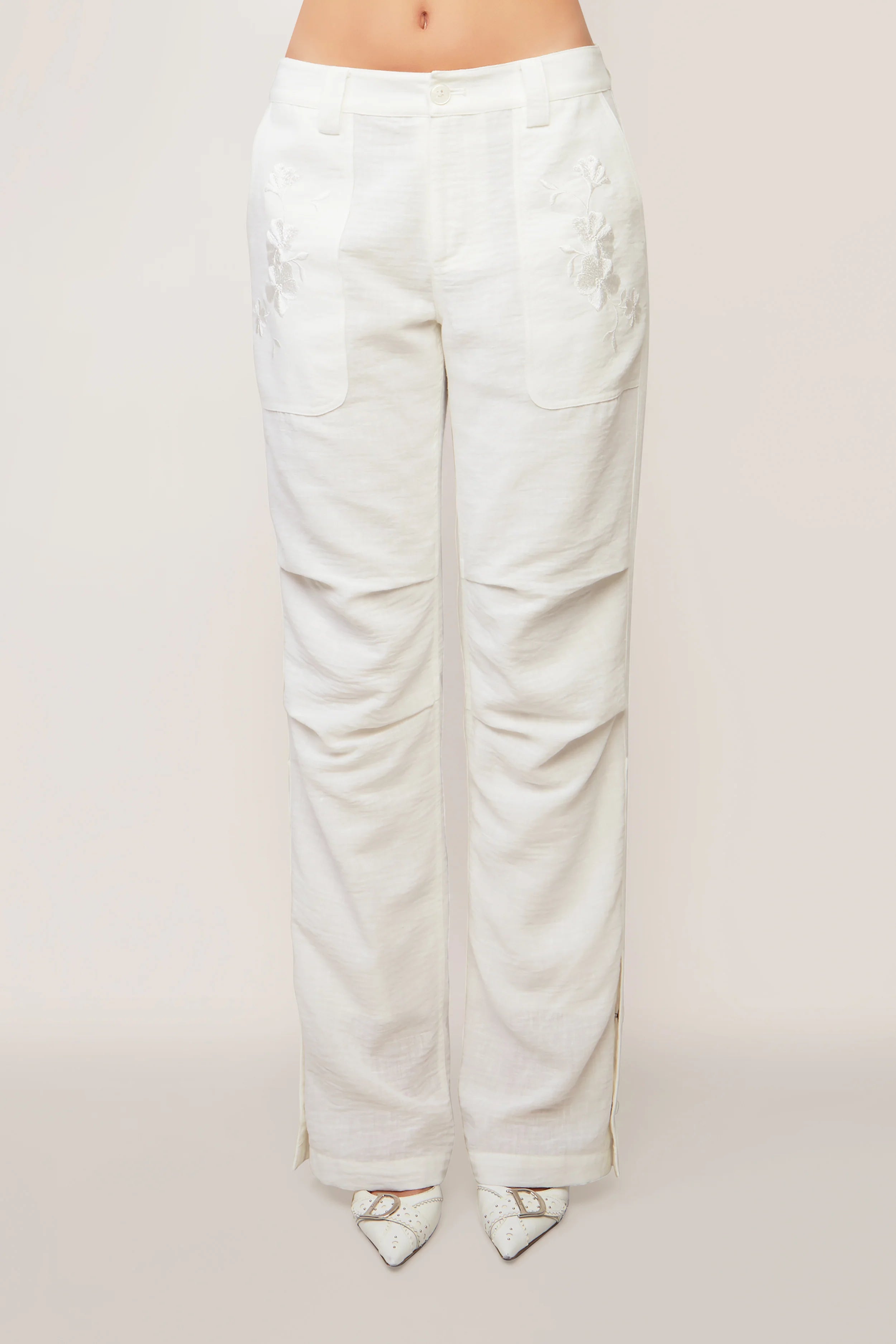 We love a cargo pant – and even more when it's summer-ready. Our Embroidered Cargo Pants are just that. crafted of a lightweight gauzy linen-like fabric. embroidered with tonal flowers and finished with pleating at the knees for shape. We're wearing them with the matching top as our casual warm weather go-to.