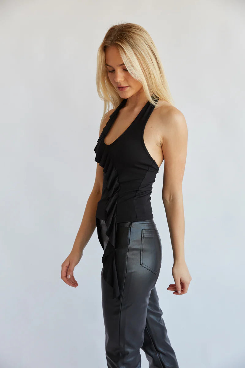 Be a style icon in the Etta Ruffle Halter Top! This trendy top features a halter neckline, cropped fit, and a cascading asymmetrical ruffle detail. Pair with the for an edgy going out 'fit!