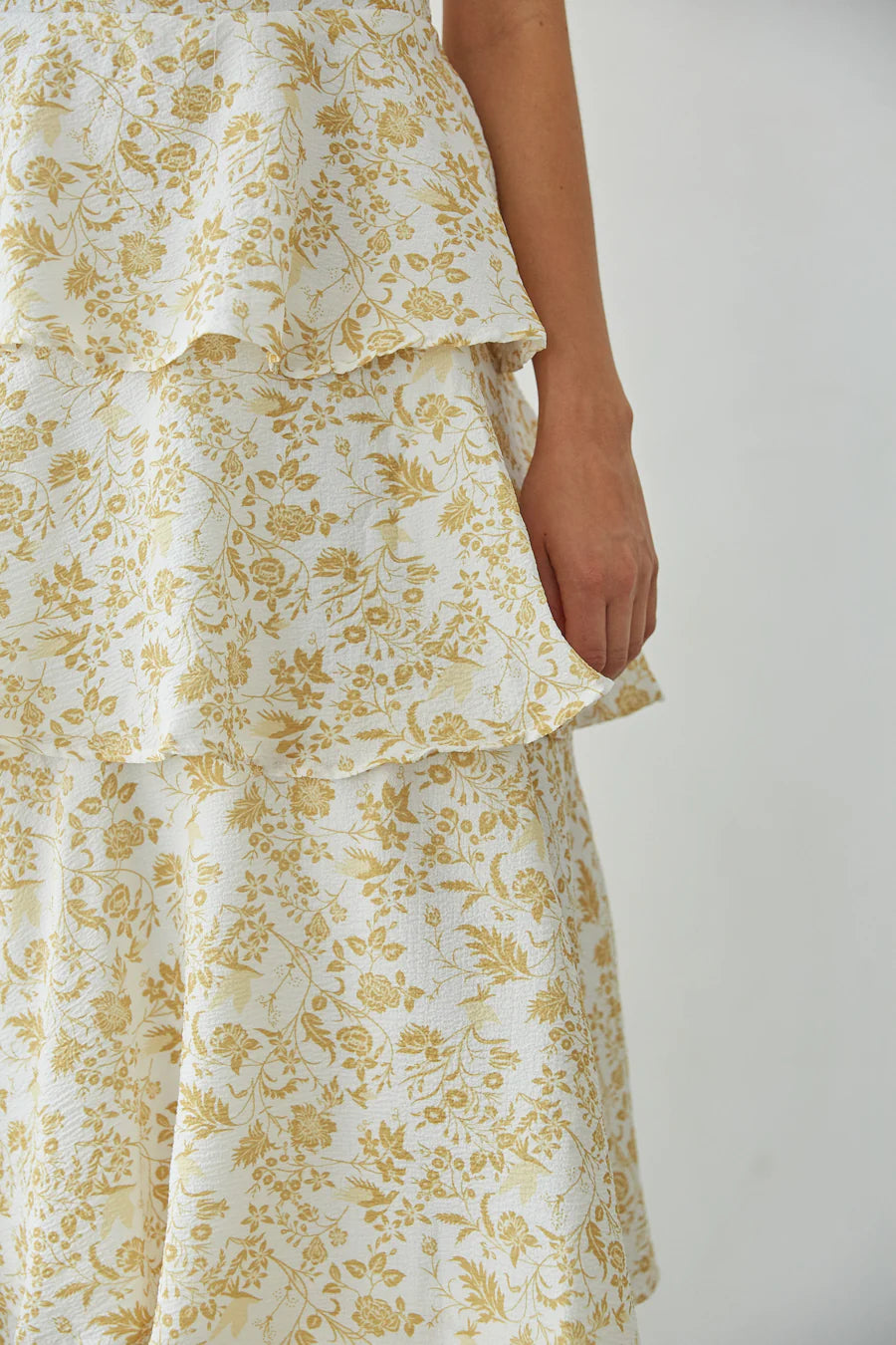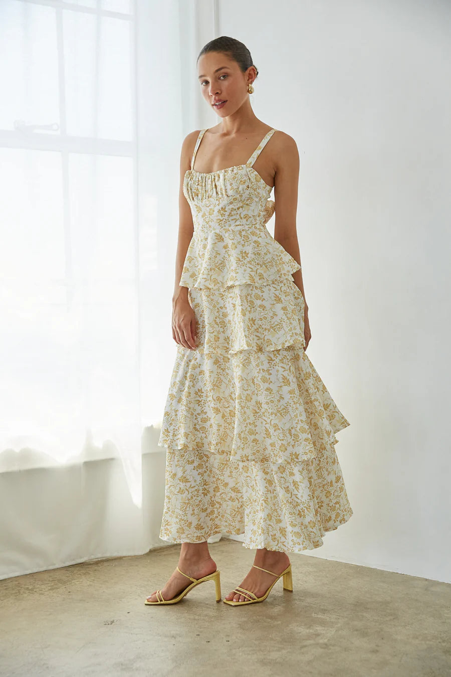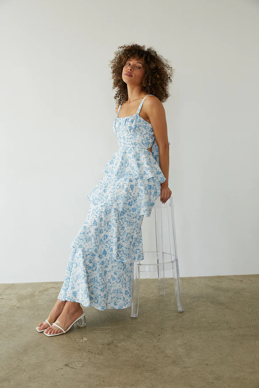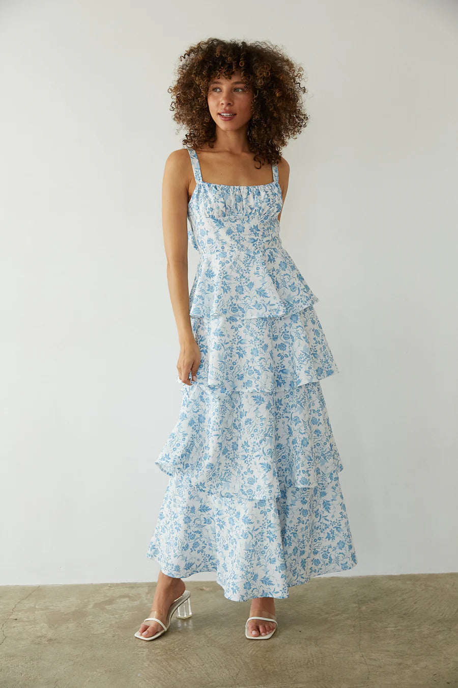 Serve certified sweetheart in the Everlee Bustier Tiered Maxi Dress! This features a tiered ruffle skirt, corset bodice, and floral pattern. Available in Blue Floral and Yellow Floral; to polish off the look!