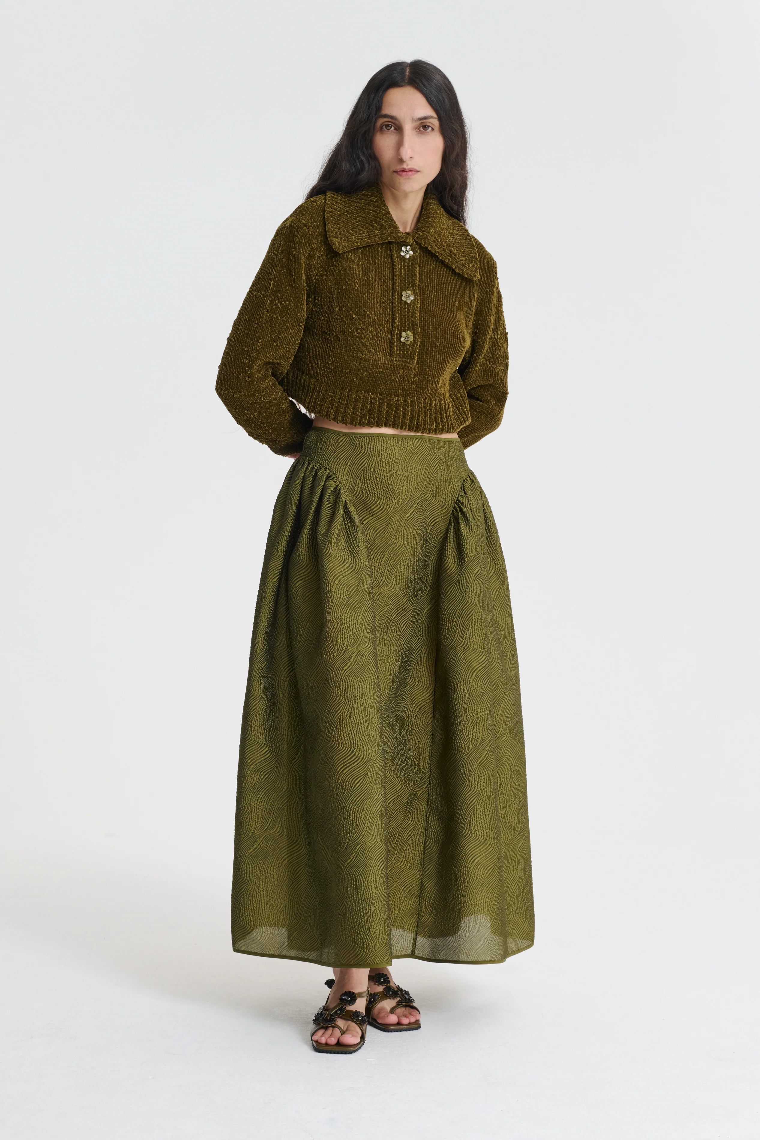 A contemporary yet poetic form. the Fabiola Skirt. Dreamt up in olive. embodying a soft silhouette that comes together from an olive kaze matelassÈ. Featuring hip panels placed at the sides of the silhouette. complementing the feminine form.