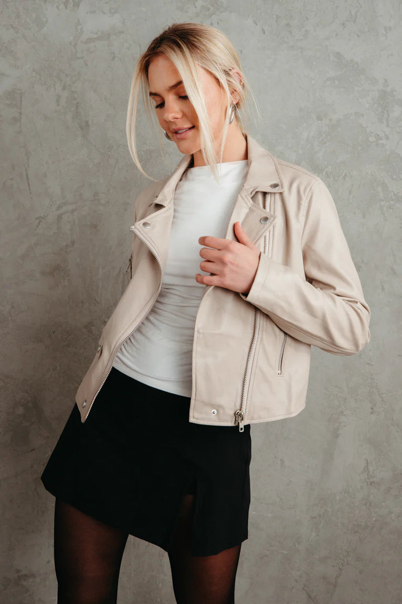 The Fallon Faux Leather Jacket is a must have closet staple. Featuring a pointed collar button detail and double zipper side pockets. Pair with some to complete the look!