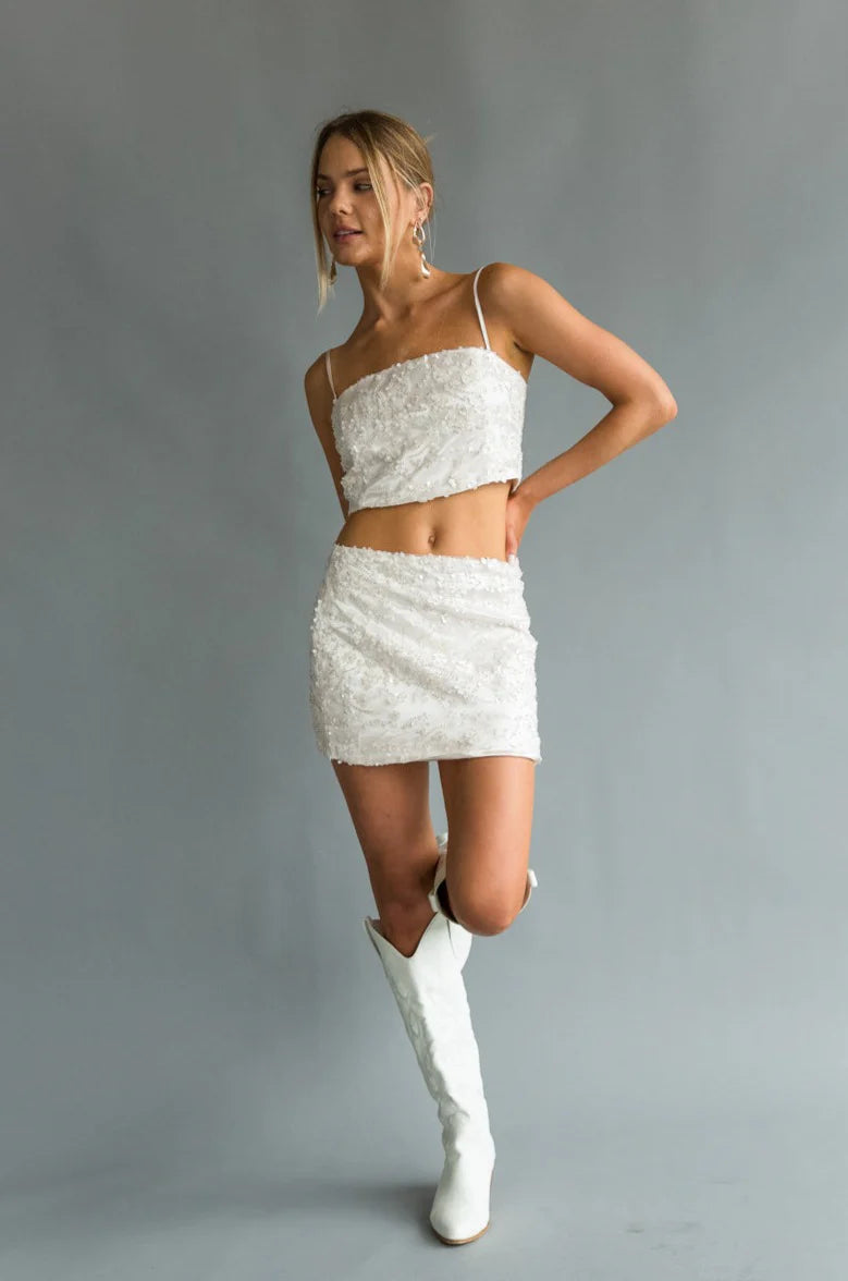 Purely dazzling, the Fayetta Floral Sequin Top is fit for the diamond of the season! This embellished crop top features sequins, beading, and floral appliqué detailing. Pair with its matching piece the t to complete the outfit!