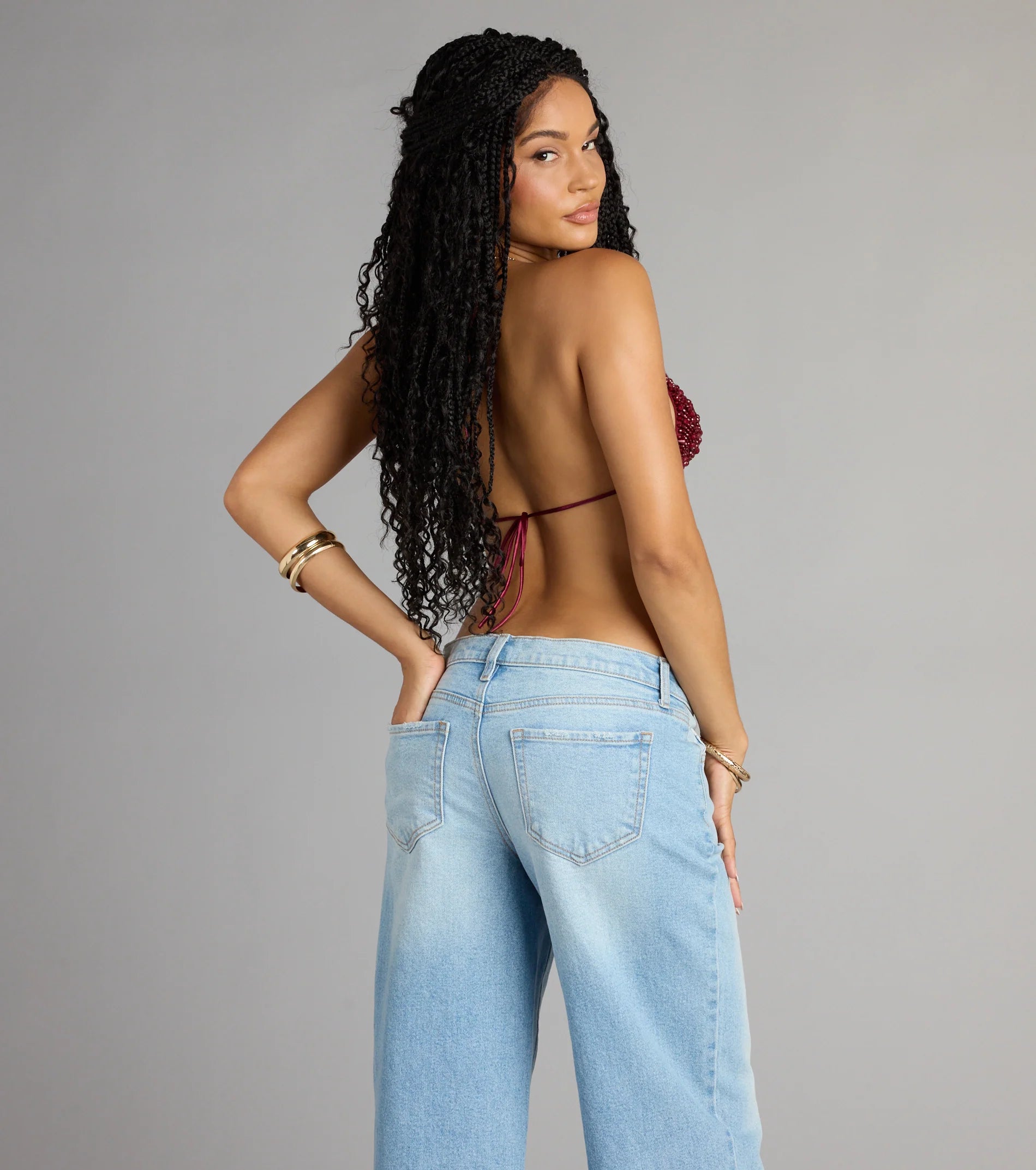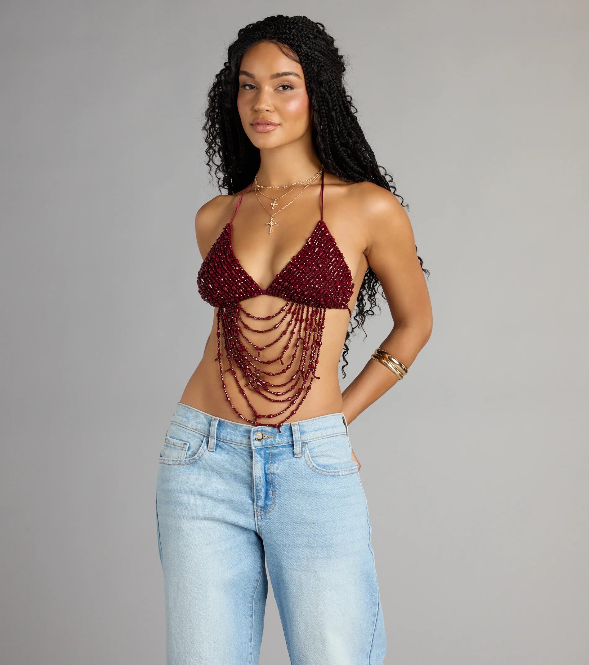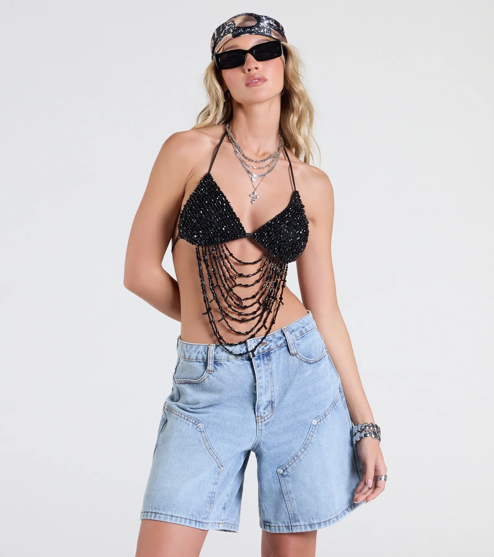 Headline the show in this beaded triangle bralette to make a statement at festivals and concerts! Style with edgy denim shorts for a cool look.