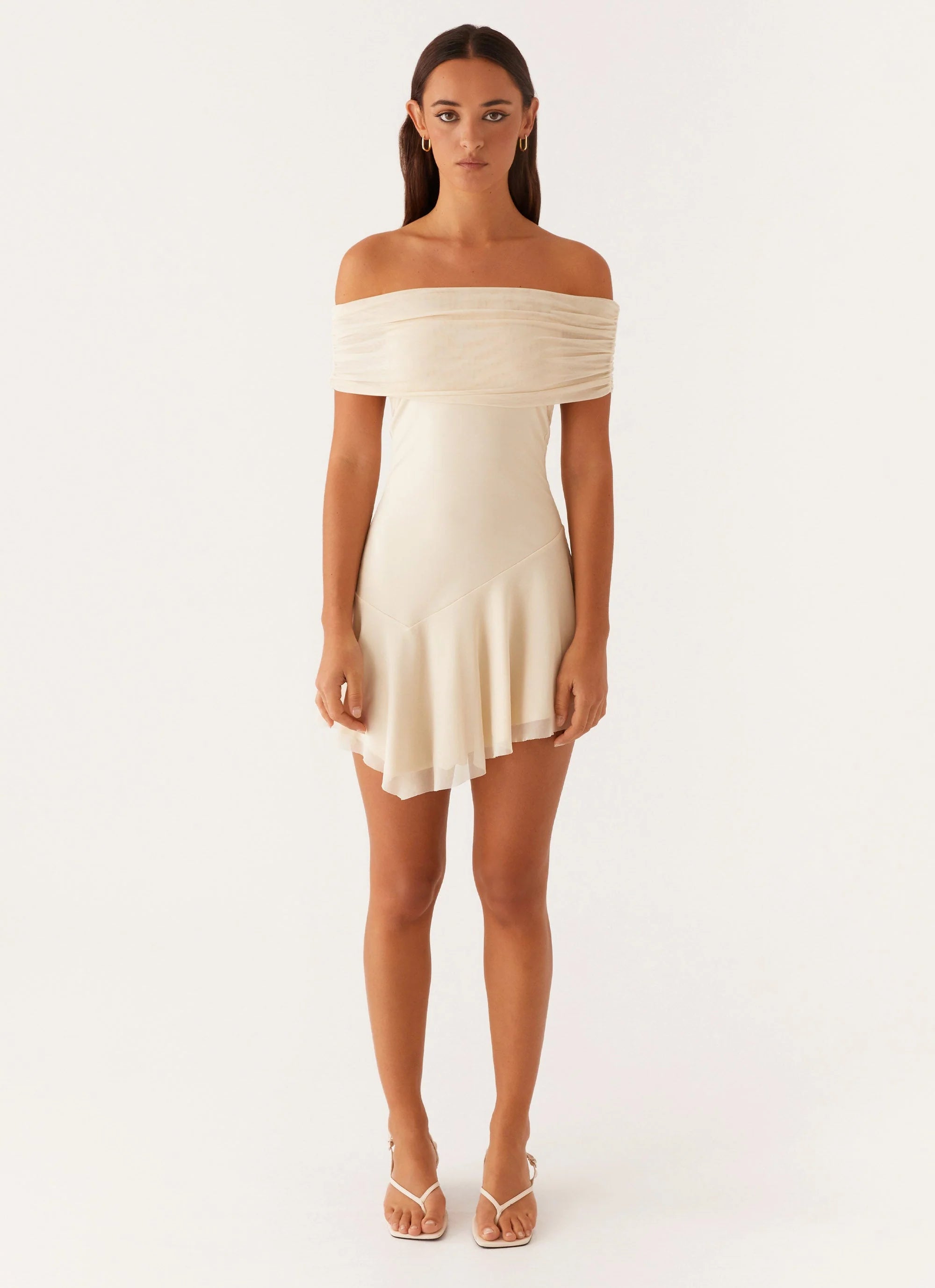 The Finola Off Shoulder Mini Dress captures playful sophistication with its chic design. Featuring ruched shoulders and a flared skirt, it offers a flattering fit that sways effortlessly with every step.