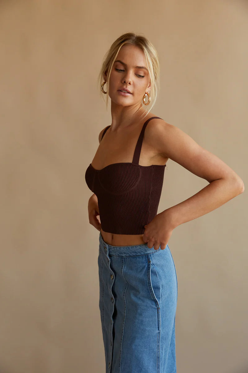 The Fiore Ribbed Bustier Crop Top is going to be in heavy rotation this season! This corset-style sweater top features a cropped fit, scoop neckline, and thin shoulder straps. Pair with the to complete the look!