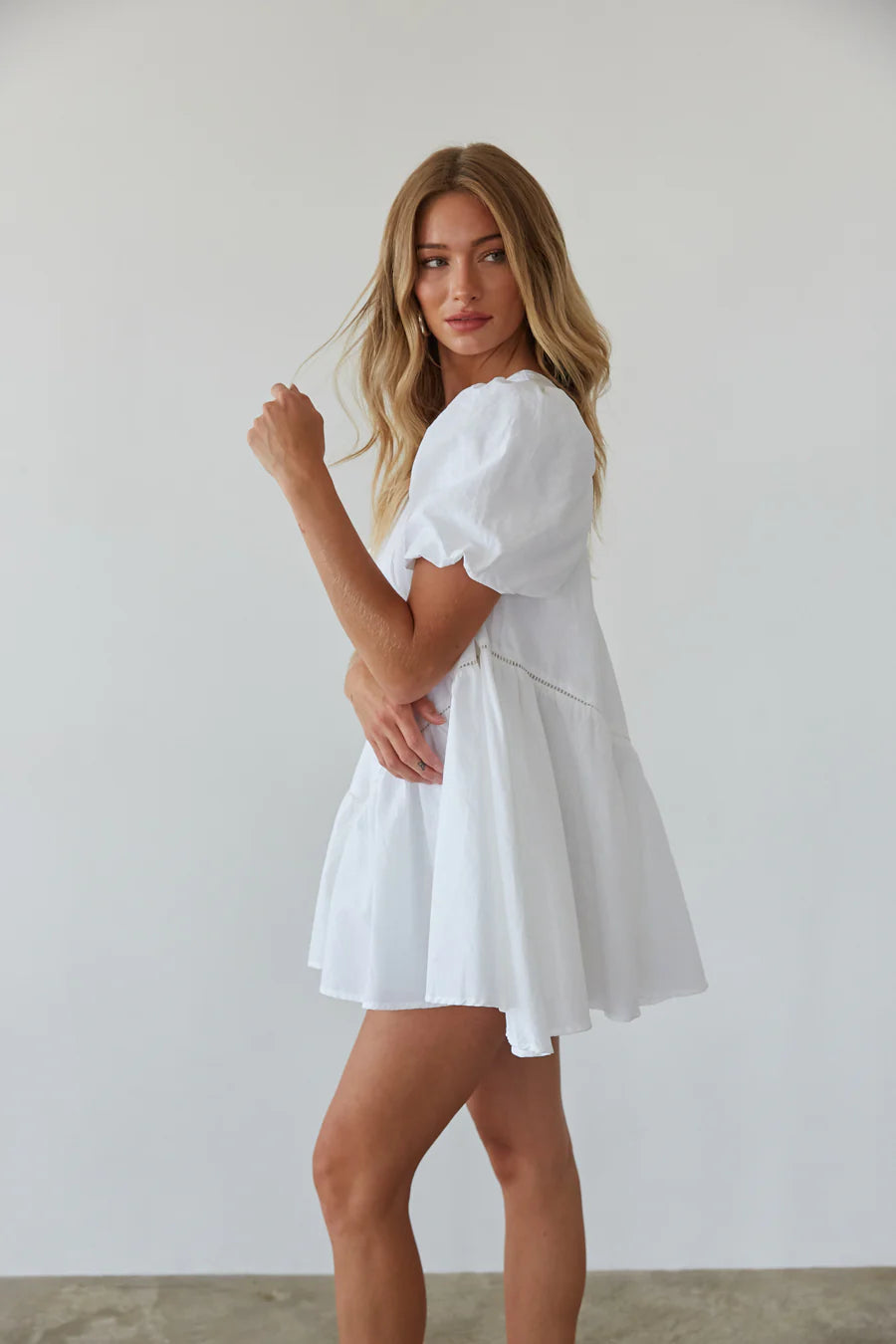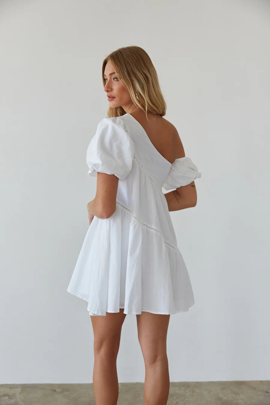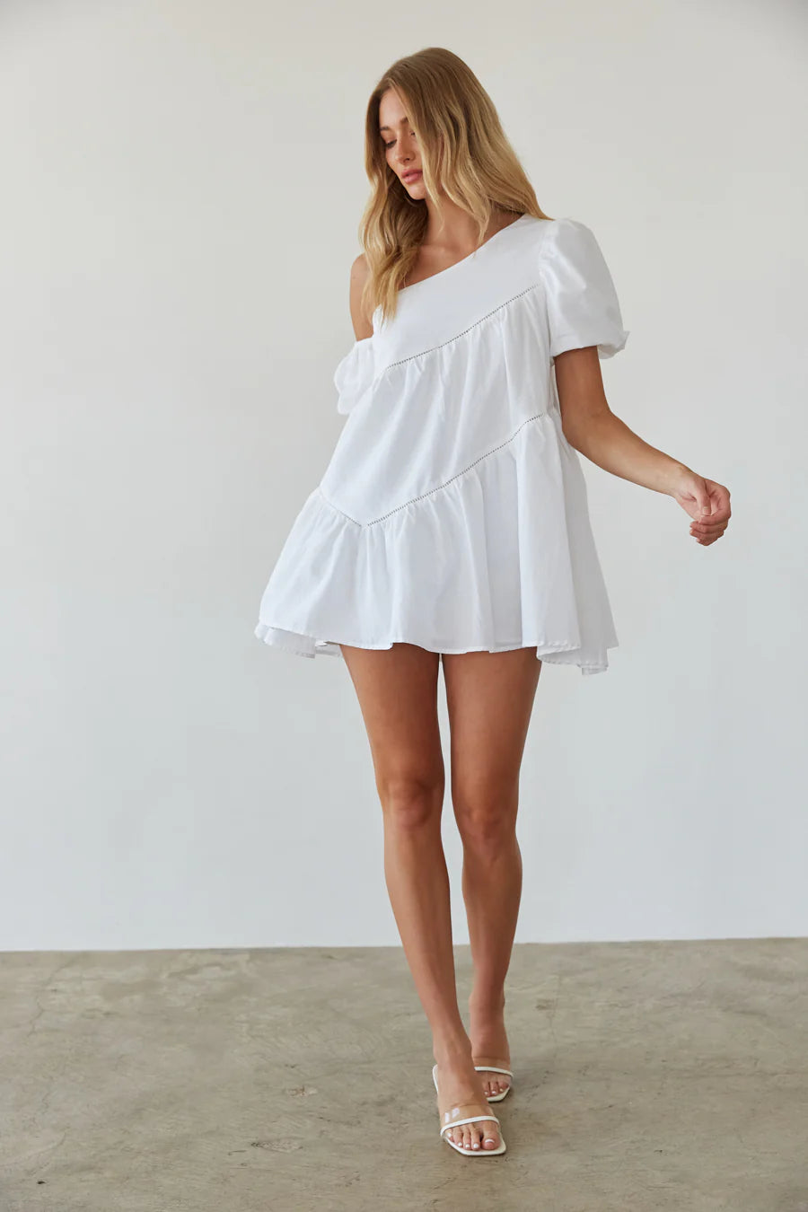You'll look sweet as can be in the Francesca Puff Sleeve Babydoll Mini Dress! This adorable dress features an asymmetrical neckline with one on and one off the shoulder puff sleeve. Available in black and red. Pair with your favorite to complete the look!