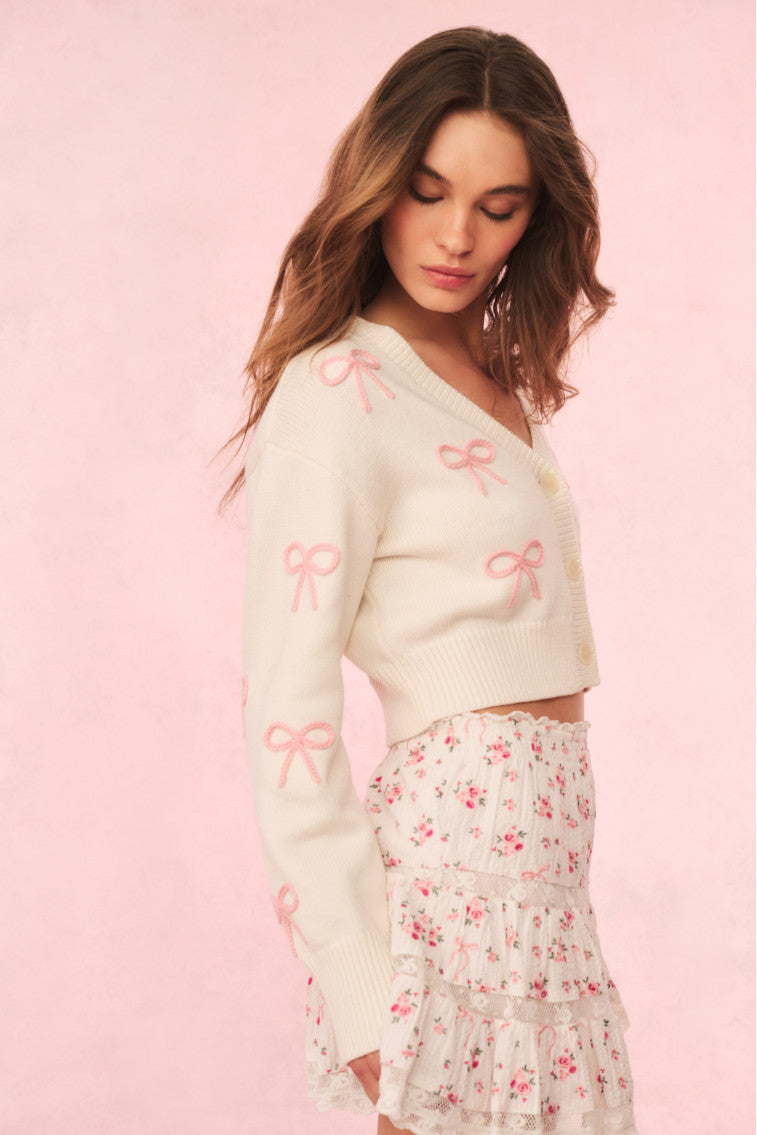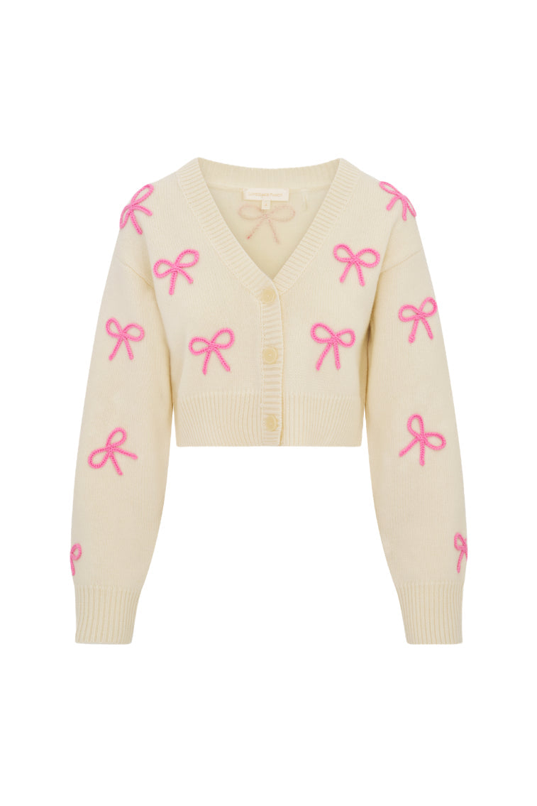 Add a cute layer with the Francette Cardigan. This cropped knit is designed from a cozy cashmere wool blend and features our custom LoveShackFancy faux shell buttons with our custom bow detail down center front and yarn-embroidered bows thoughtfully placed throughout the body and sleeves. Because everything’s better with a bow.