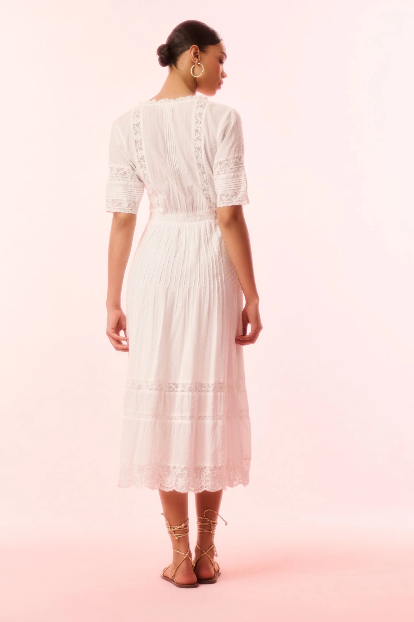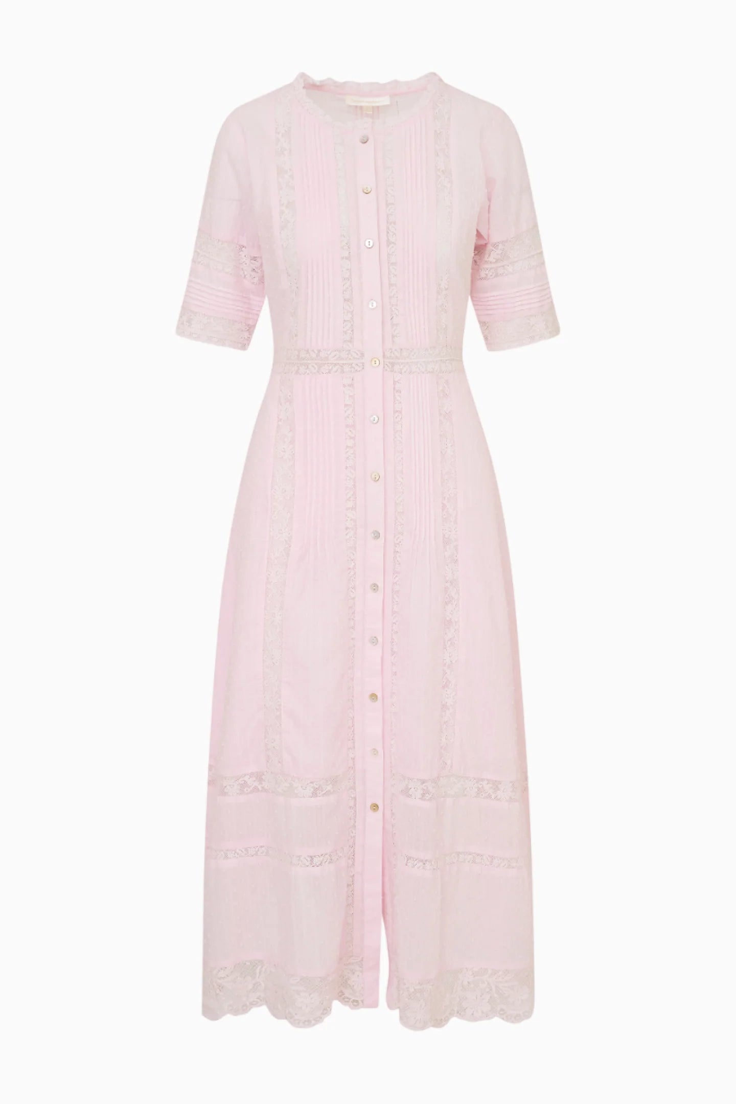 The Francilla Dress debuts with a cotton fabric adorned with vintage-inspired laces. The A-line shirt dress features a button down placket that can be unbuttoned to the wearer’s desire, slim and flattering short sleeves, and an airy skirt.