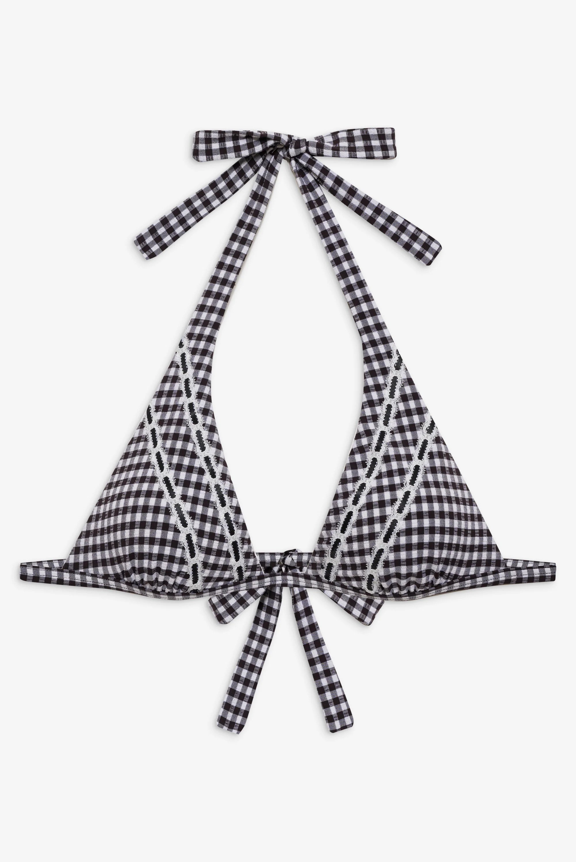 Lounge on the beach all day in the Frank halter bikini top. This trending bikini top features specialty lace detailing and a brand new Blackberry Gingham pattern on a textured fabric.