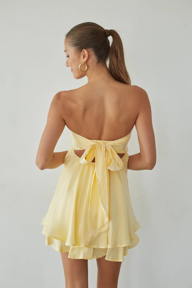Be the life of the party in the Gabby Strapless Twist Front Babydoll Dress! This sweet and sassy mini dress is made of eye-catching shimmering fabric and features a babydoll silhouette, strapless twist front bust with a keyhole detail, adjustable bow back, and a two-tiered skirt. Available in chambray, berry, and white. Pair with ayou can dance the night away in!