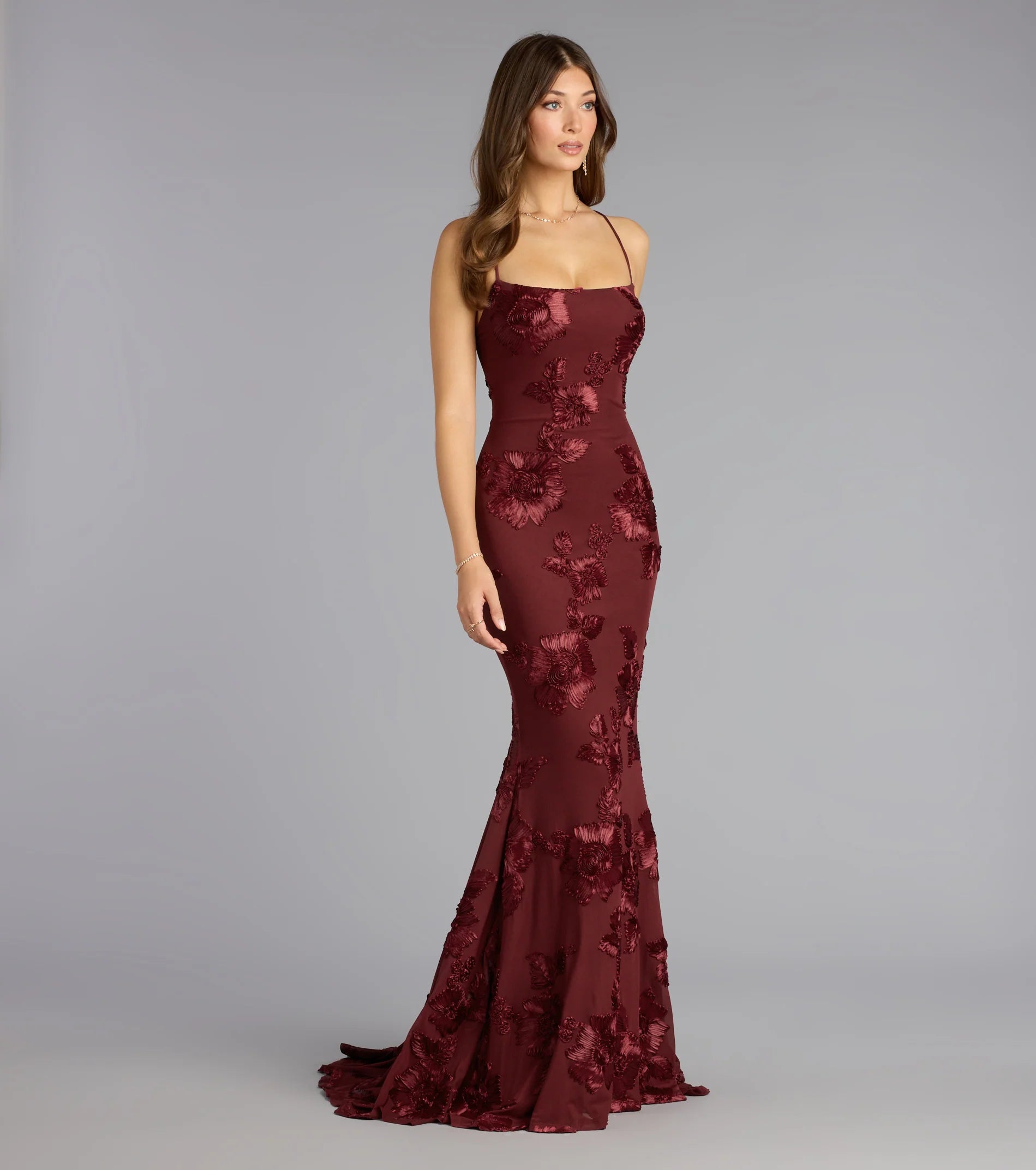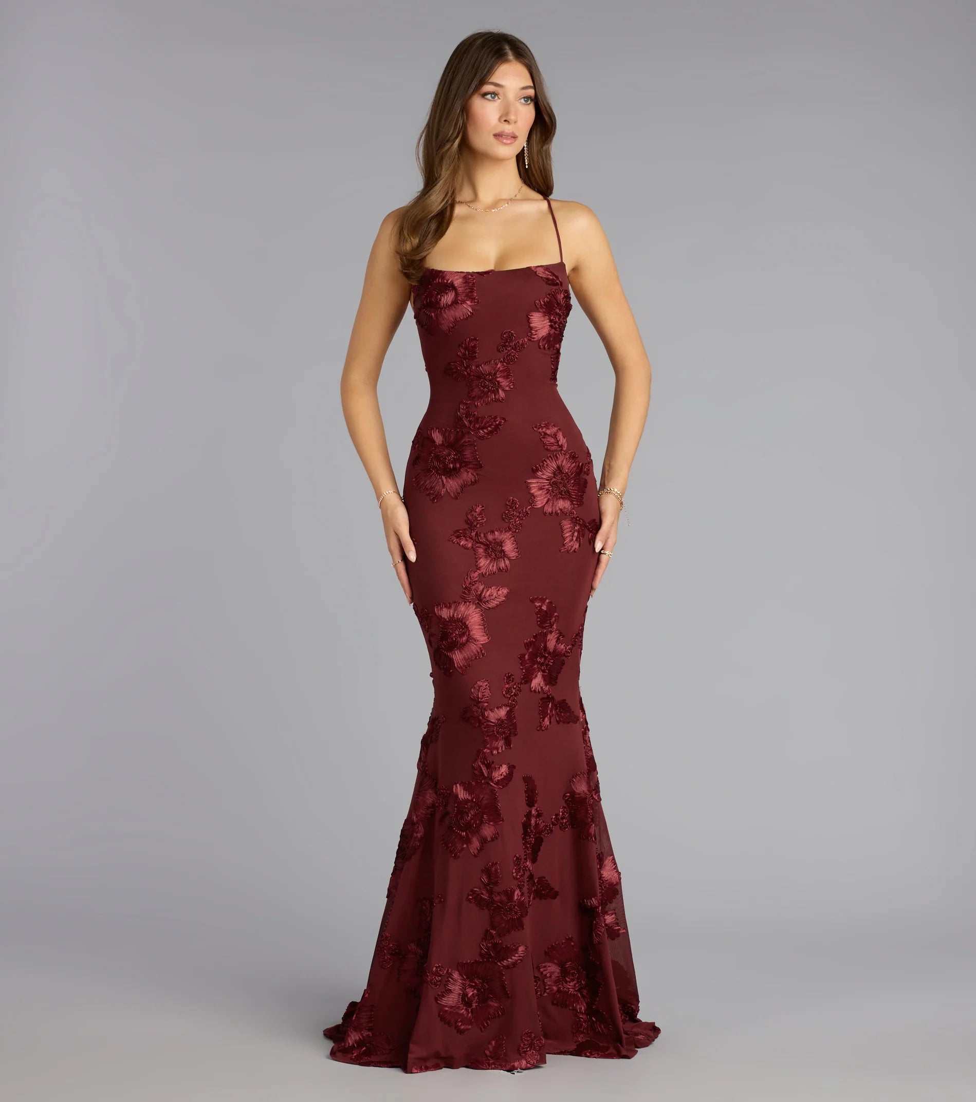 Enchant every party guest in the Gabi mermaid formal dress designed with a gorgeous floral soutache trim and a stunning lace-up back that turns heads.