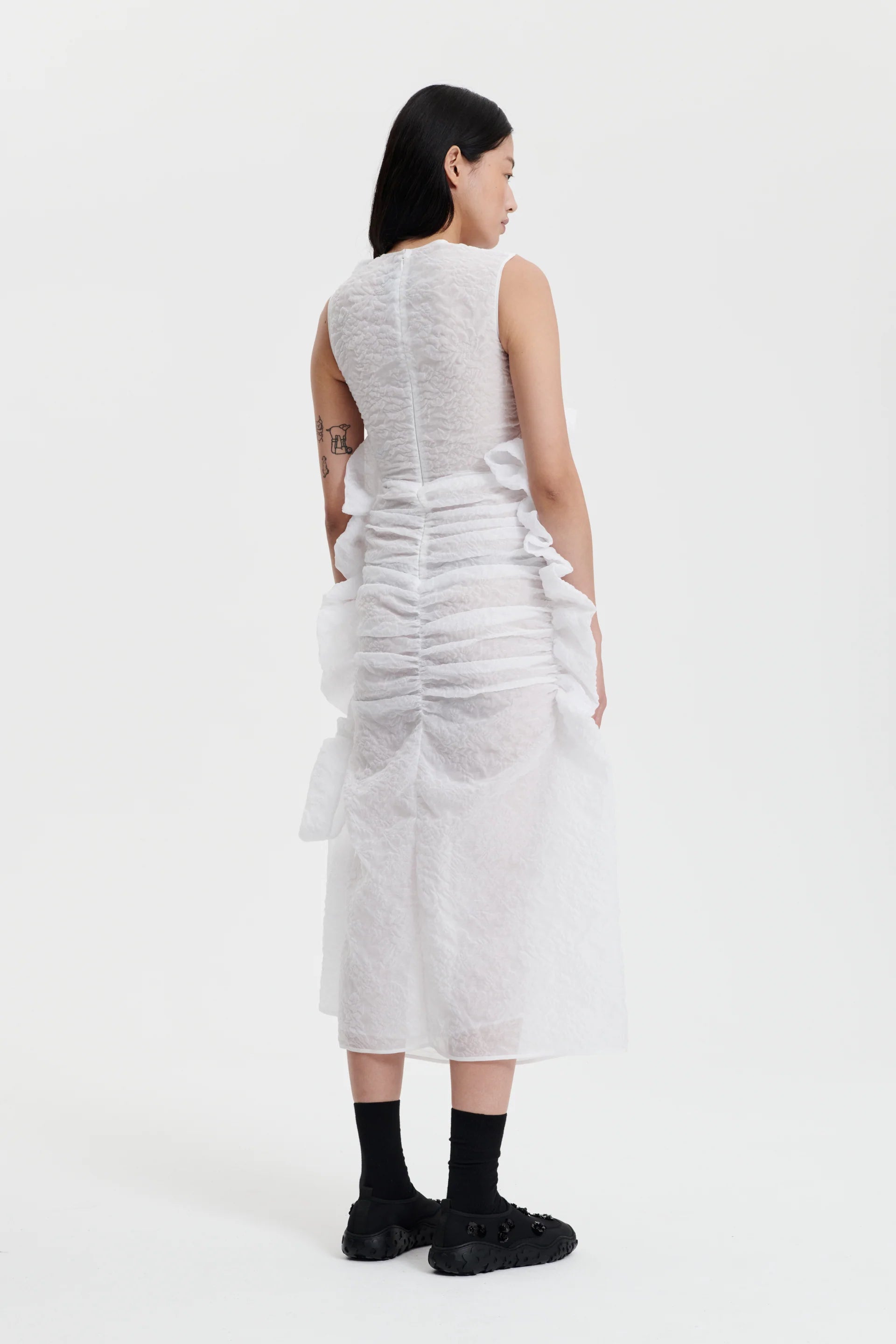 Cut from a dream-like posy matelassÈ. the Gabriella dress is a vision of tactful draping and elevated detailing. The slim silhouette is distinguished by illusory ruffles that add new volumes and shapes to the ankle-grazing gown. A signature bow is tied with ease on one side as the skirt opens up to facilitate movement.