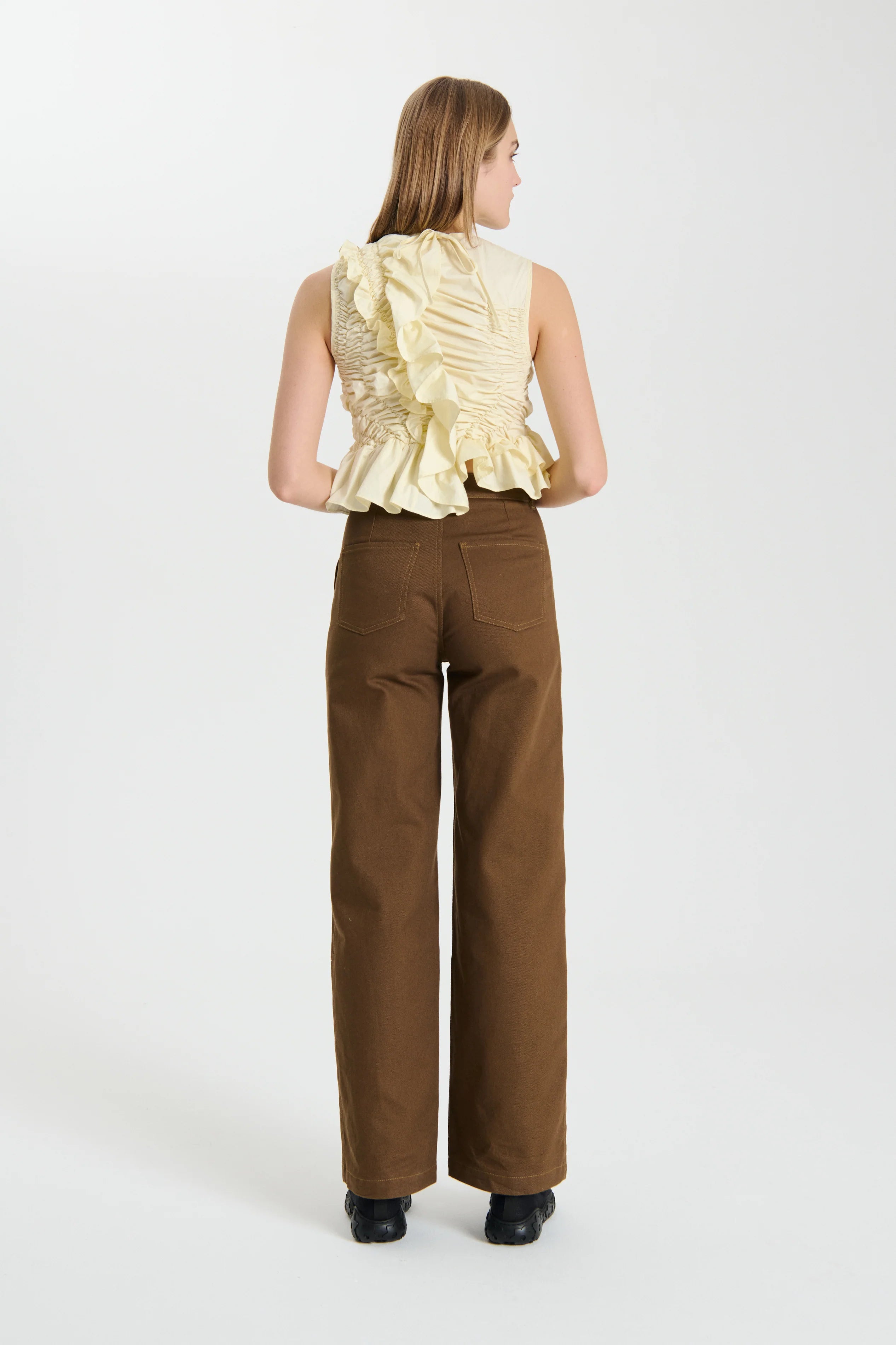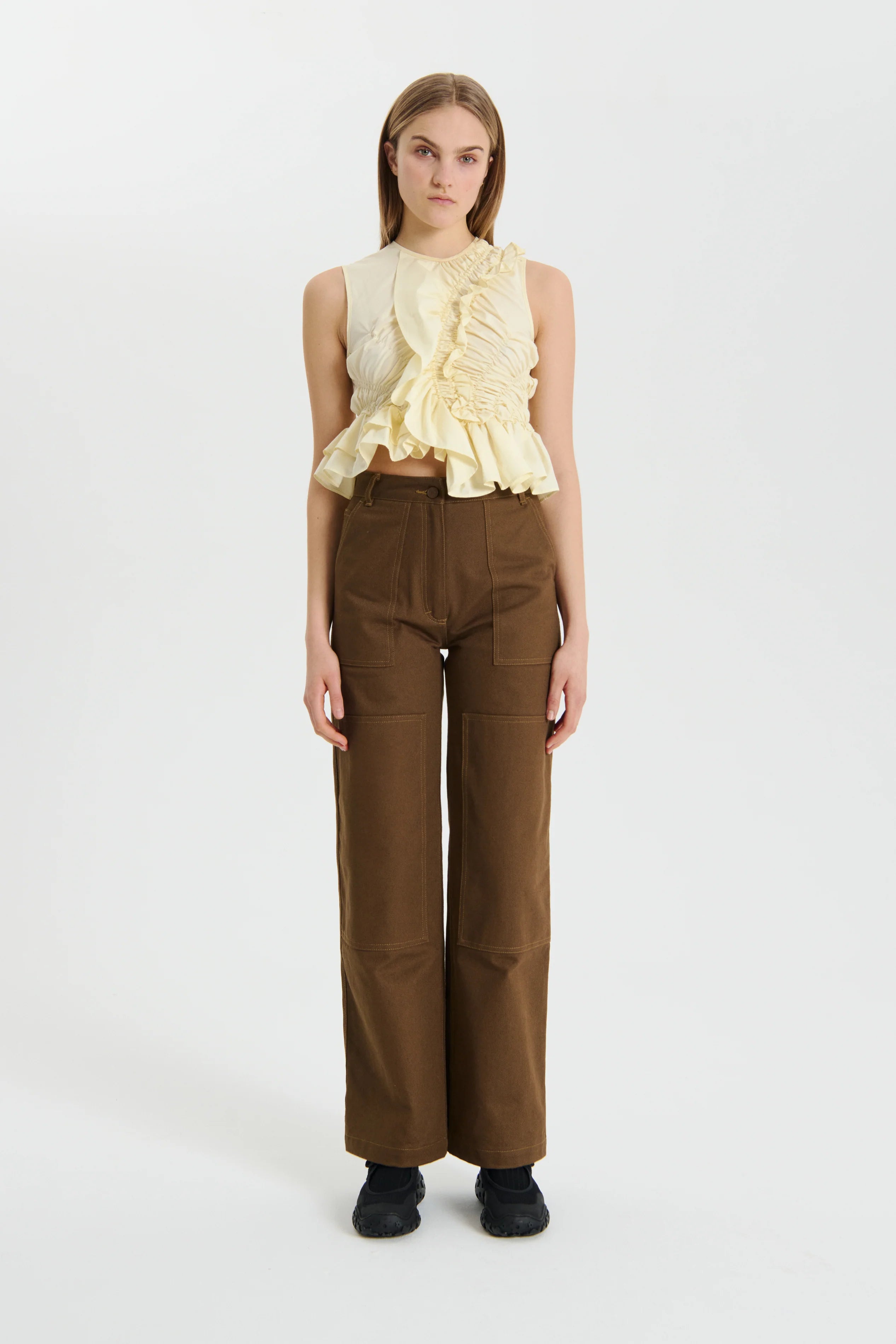 A story of ruffles. the Geo top. An asymmetrical ruching of soft yellow cotton extends romance across the body. emerging in unexpected puckers and lines. The sleeveless silhouette and cropped waist channel a modern yet girlish feel. complete with airy ruffles that run down the spine. tied with a bow.