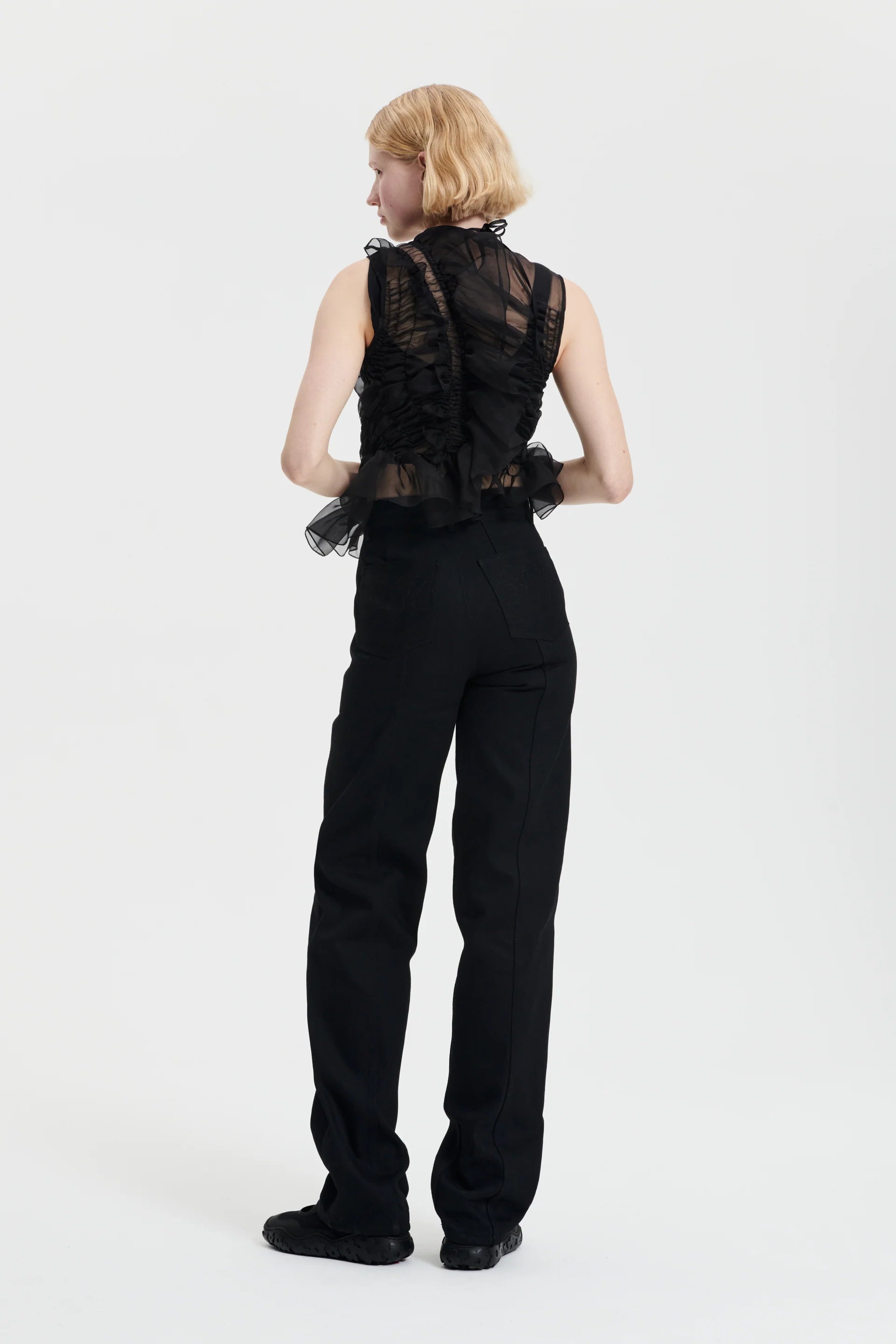 A story of ruffles. the Geo top. An asymmetrical ruching extends romance across the body. emerging in unexpected puckers and lines. The sleeveless silhouette and cropped waist channel a modern yet girlish feel. complete with airy ruffles that run down the spine. tied with a bow.