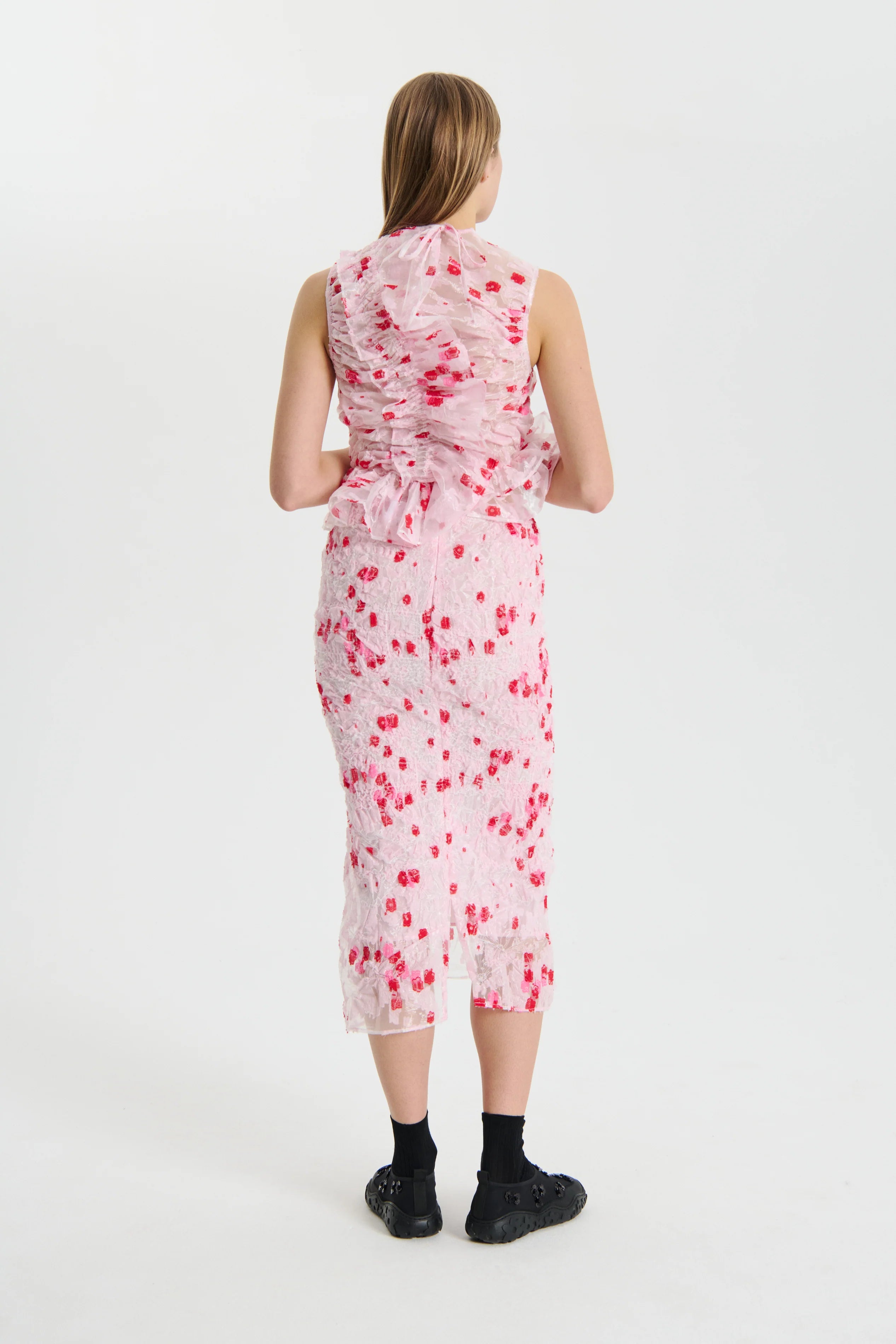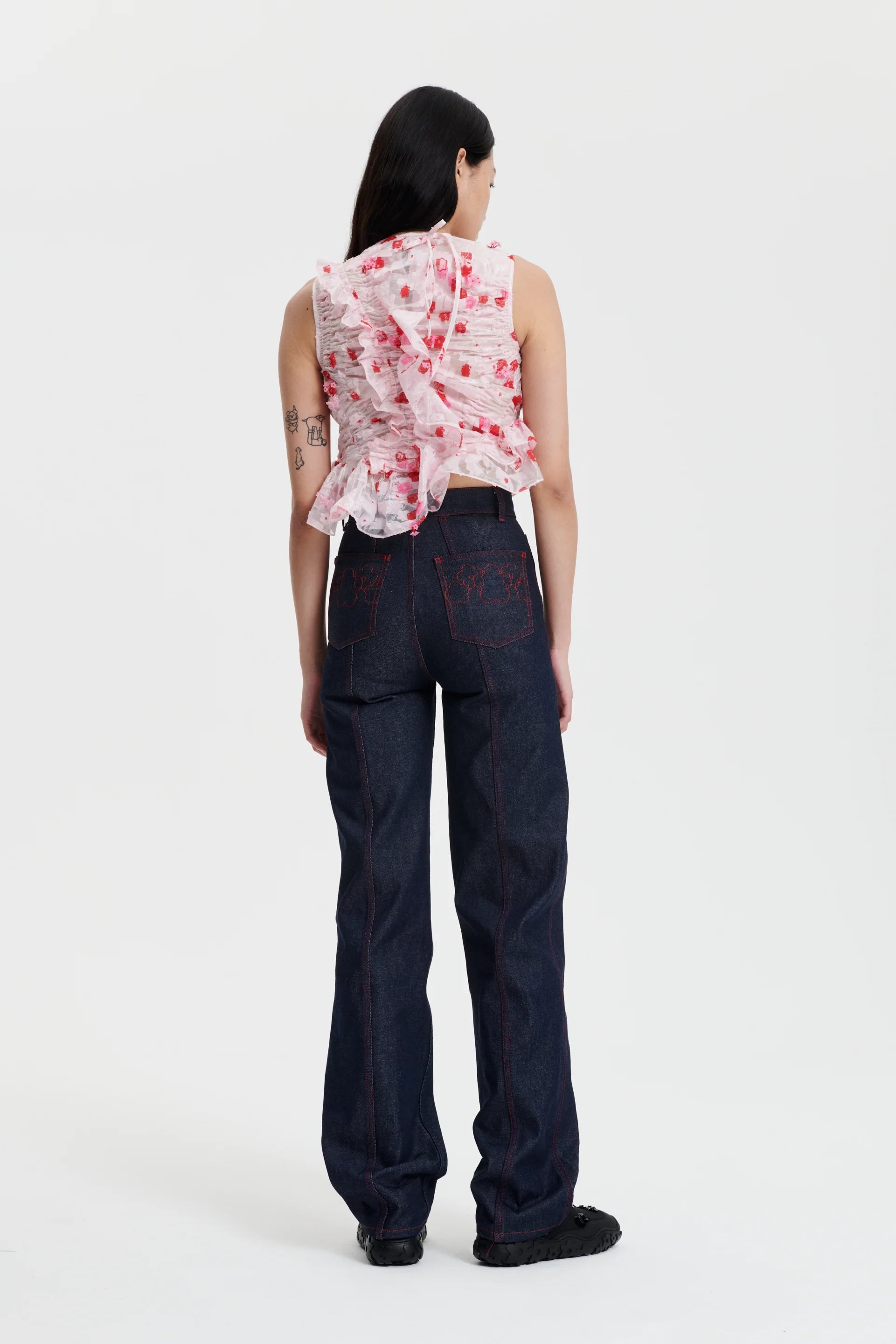 A story of ruffles. the Geo top. An asymmetrical ruching extends romance across the body. emerging in unexpected puckers and lines. The sleeveless silhouette and cropped waist channel a modern yet girlish feel. complete with airy ruffles that run down the spine. tied with a bow.