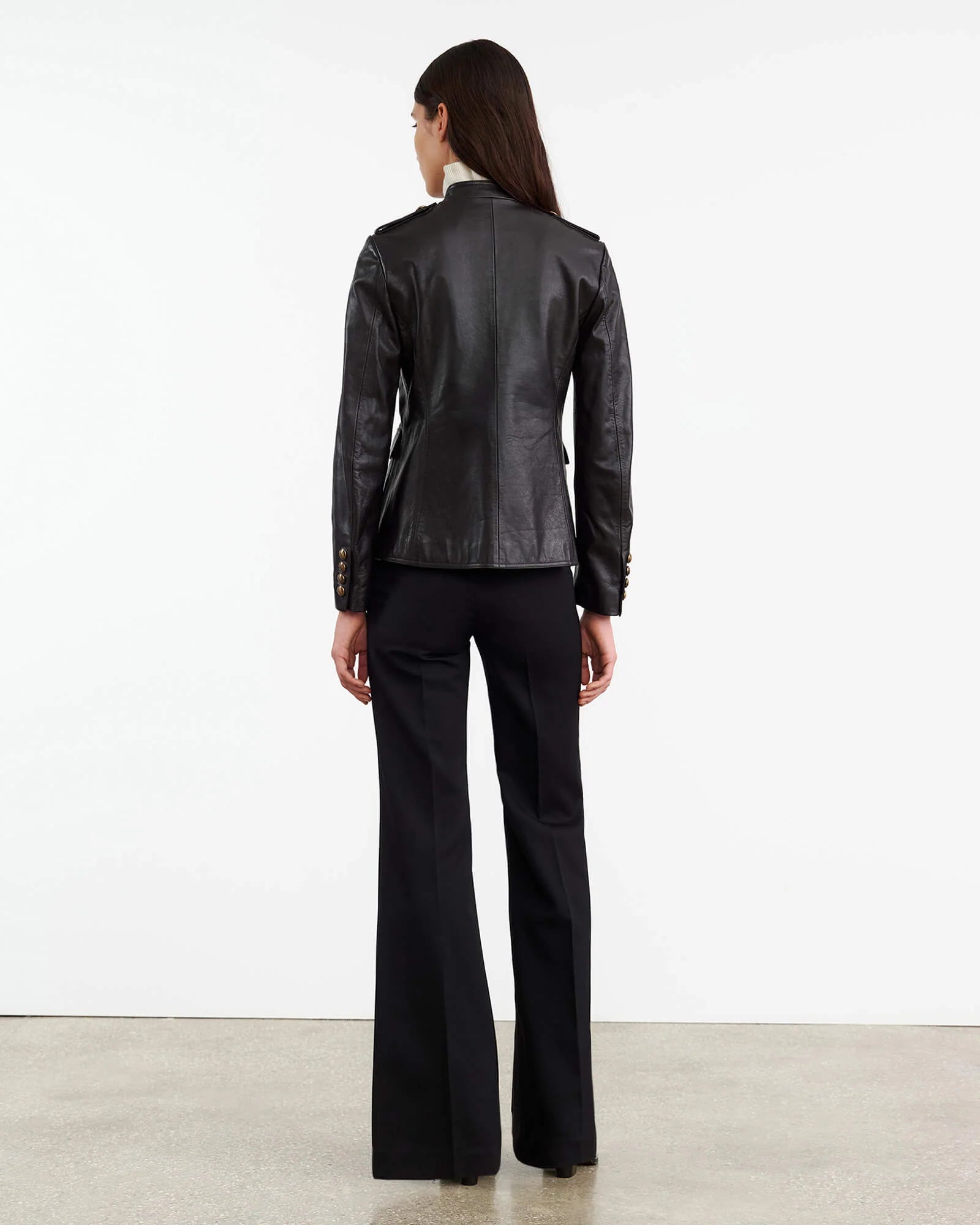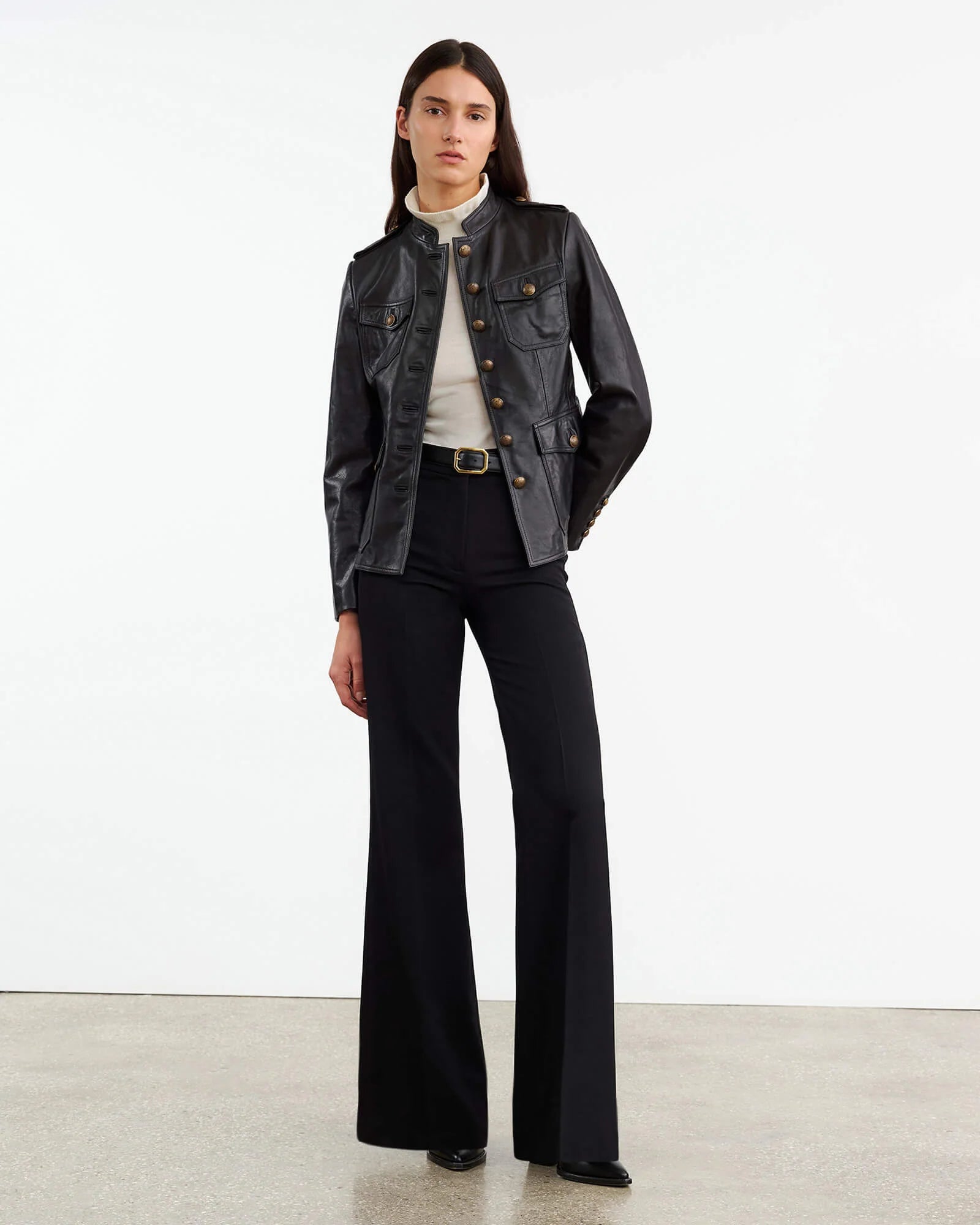 Slim fitted utilitarian jacket in leather. Signature crest buttons in antique brass. Epaulettes. Chest patch pockets with flaps. Patch pockets with flaps. Buttons at front. epaulettes and cuff. Fully lined.