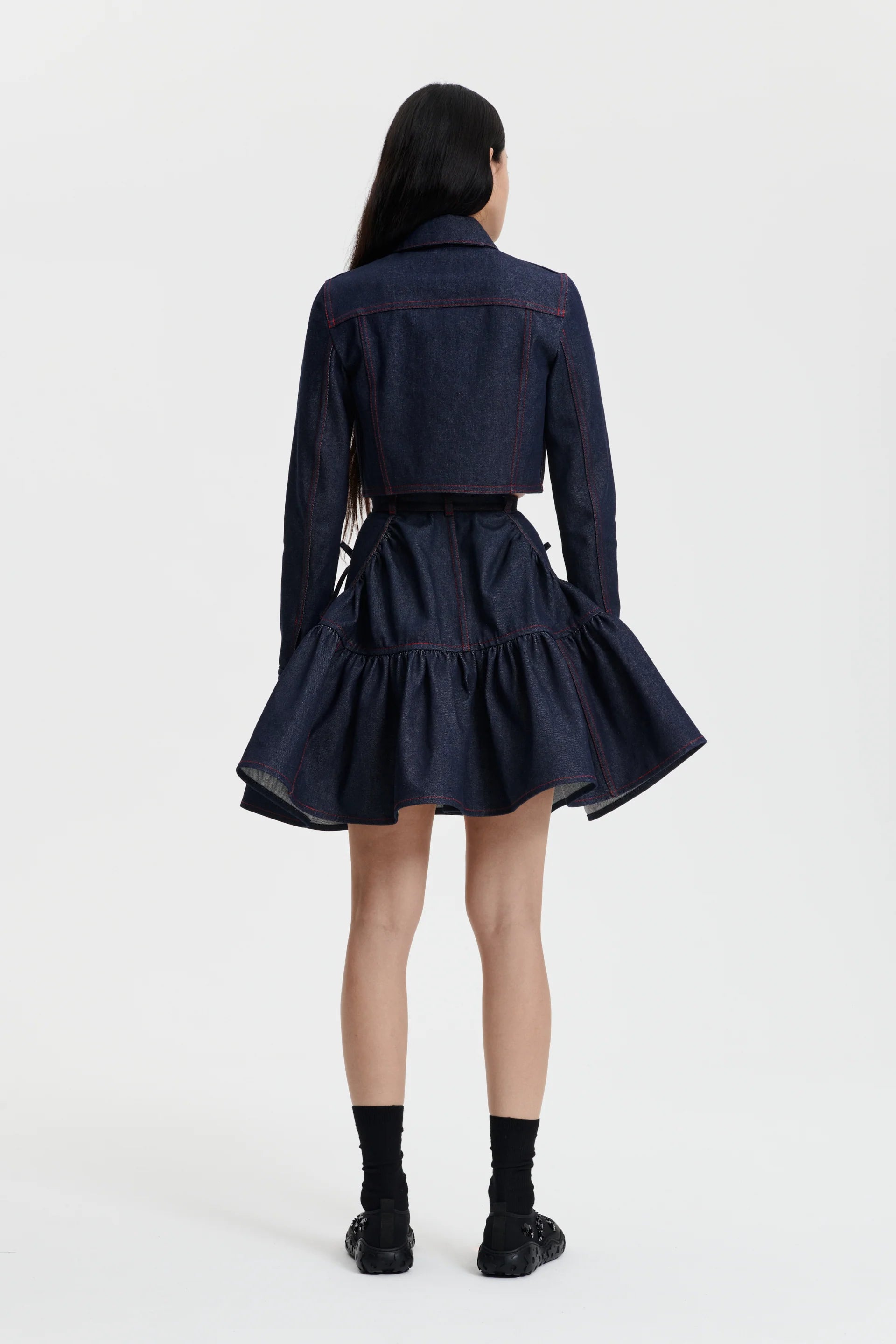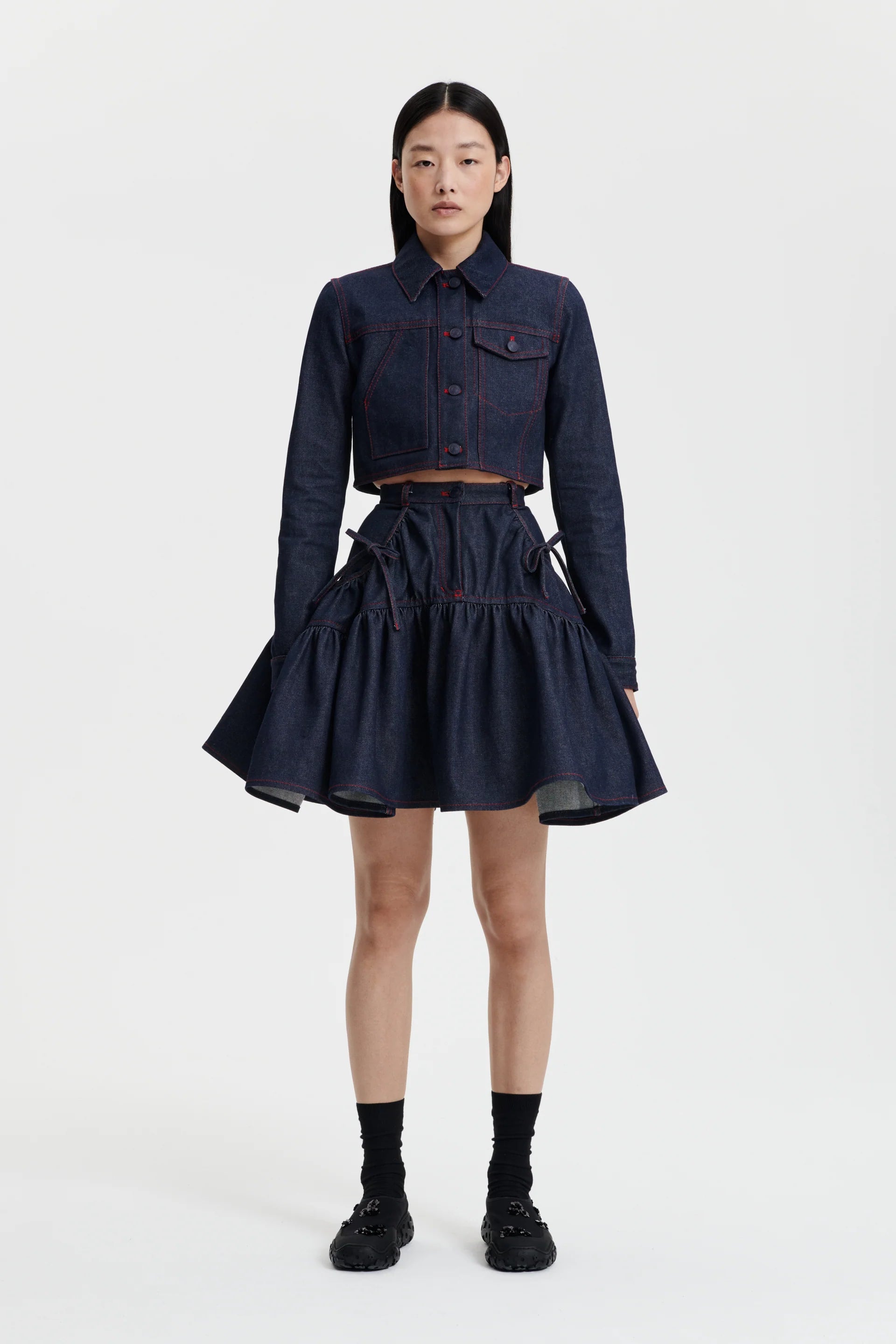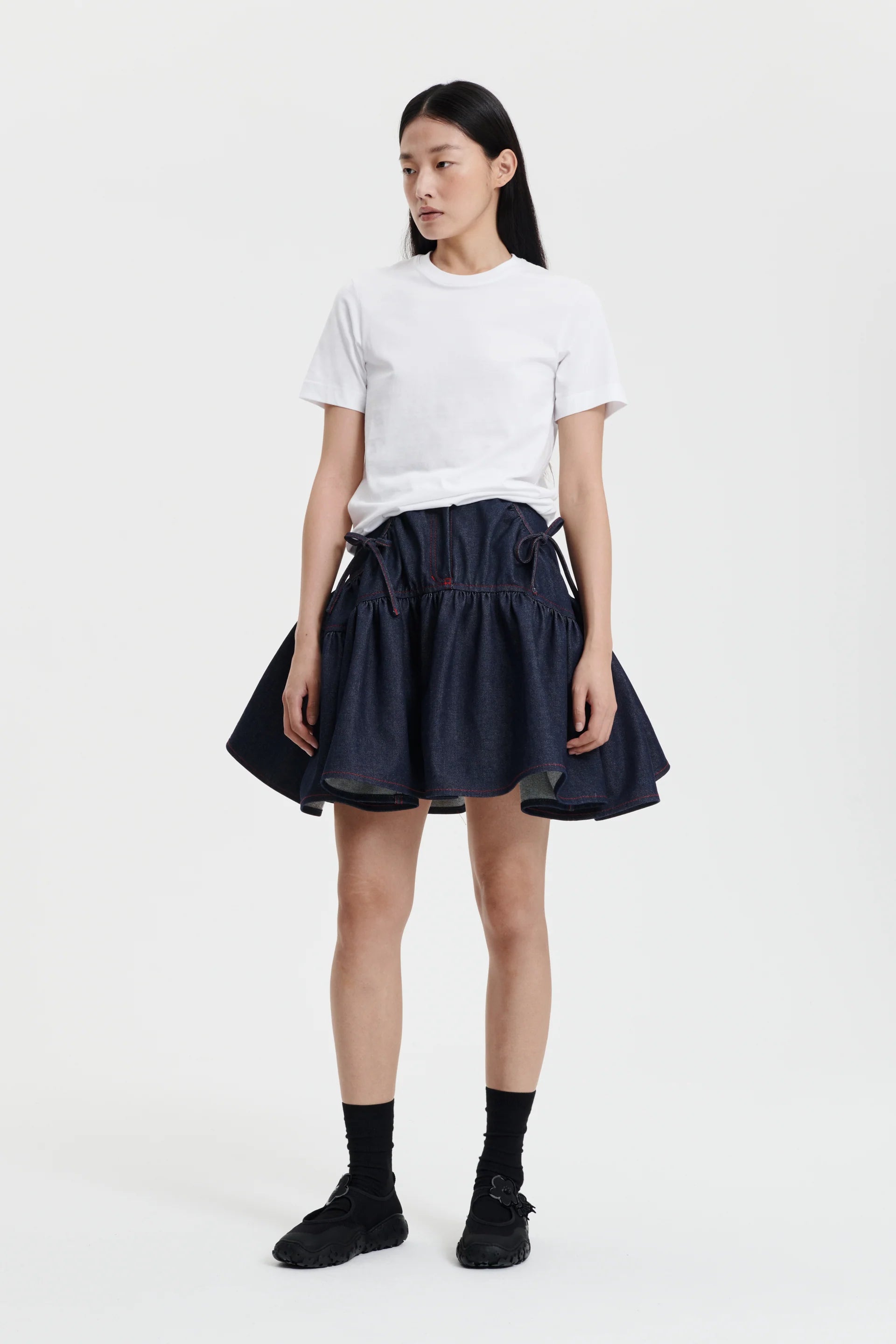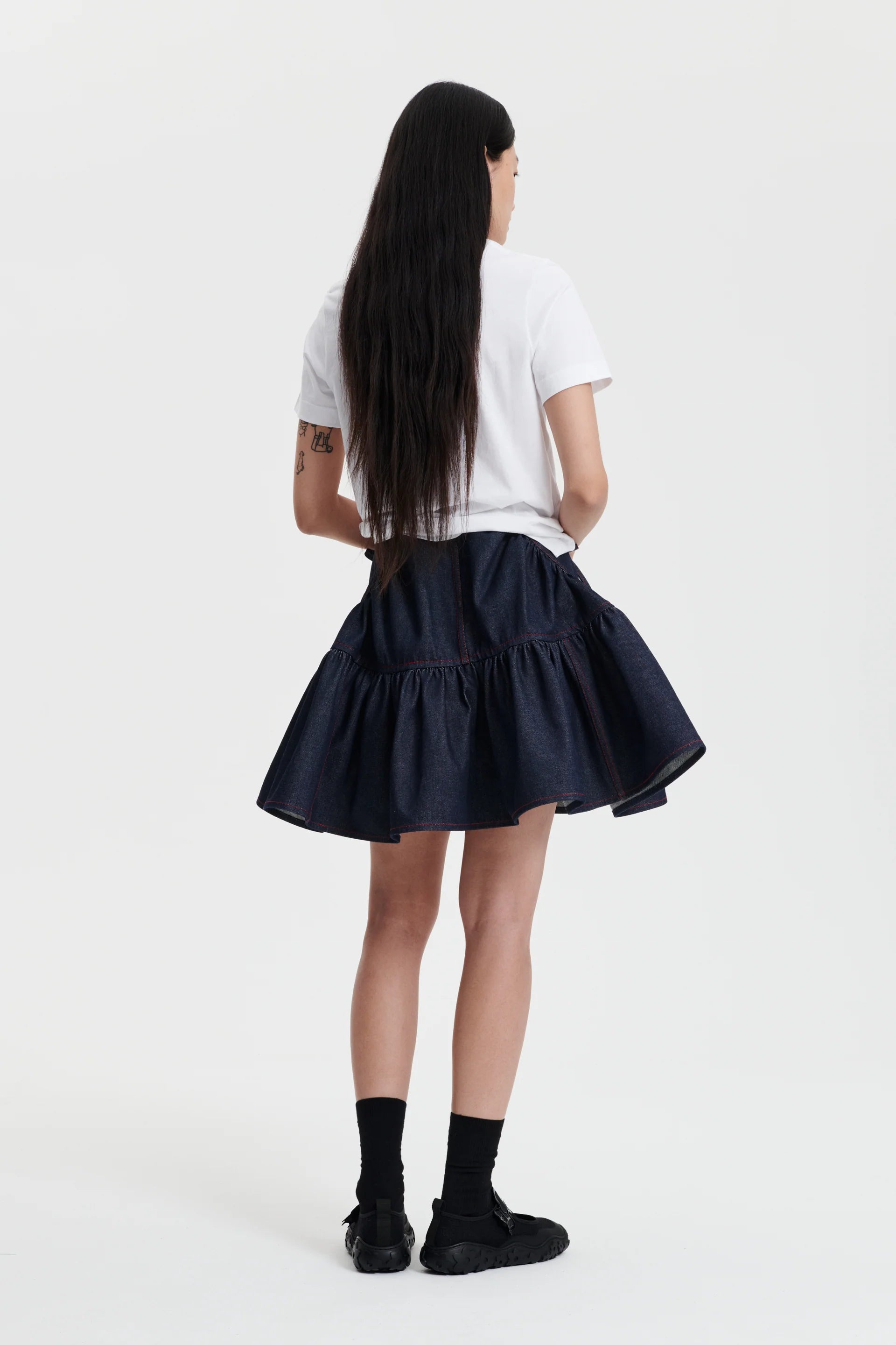 Trading masculine and feminine codes. the Gloria skirt in denim. Characterized through its tiered construction. deep pockets provide volume that can be re-adjusted with the pull of a ribbon. Contrasting red stitching references the hues of SS24 made to pair with this everyday staple.