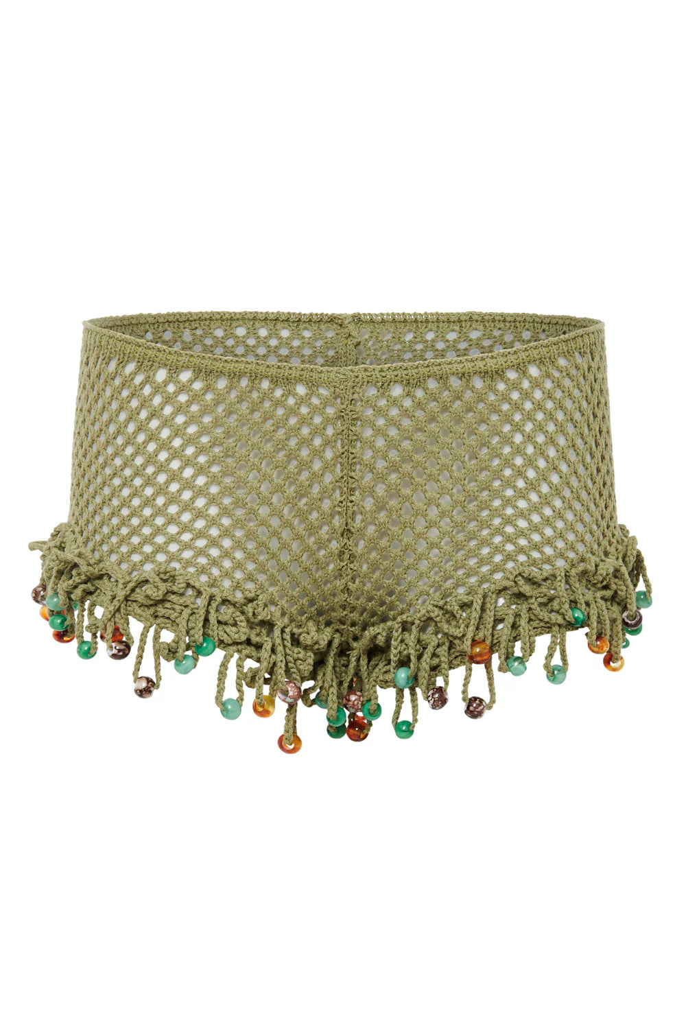 Introducing the Green Canary Knit Shorts. crafted from a green crochet fabric these hot-pant style shorts feature a beaded fringe detail with a cast off hem. Complete the ensemble with the matching bikini.