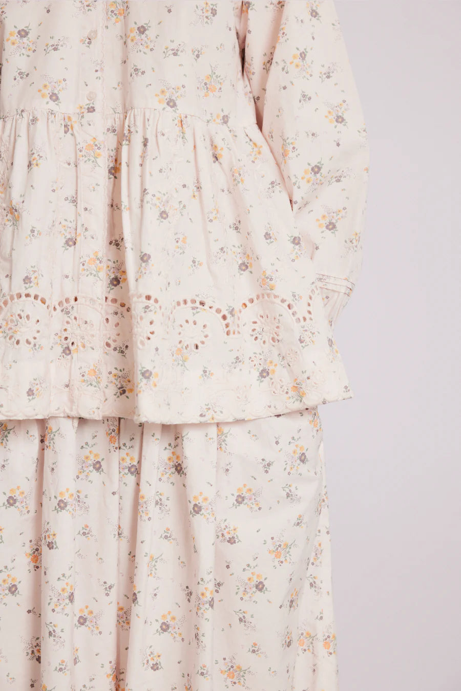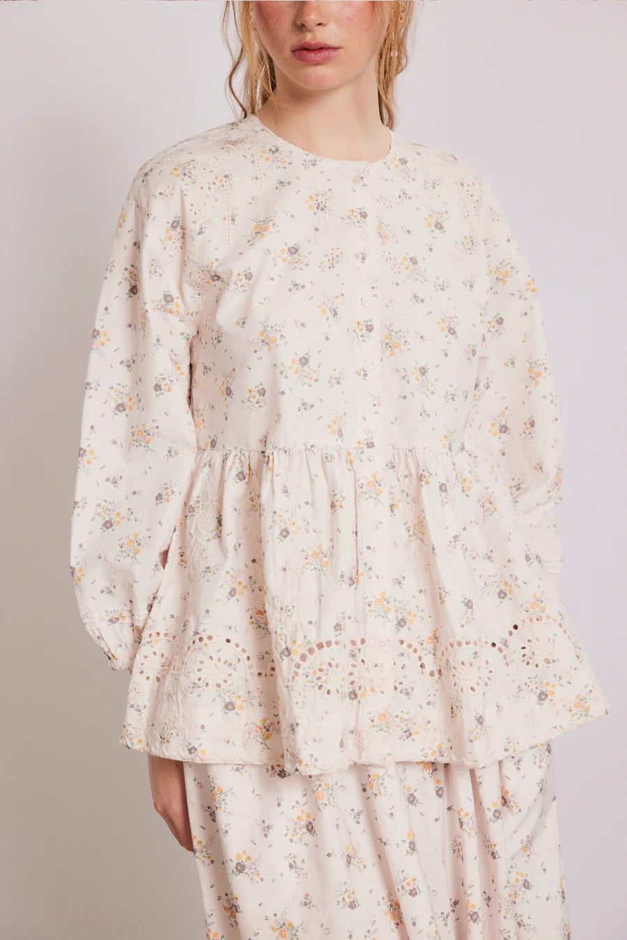 Our oversized Gretchen blouse features a delicate floral print. a button down front and broderie trims. Pair it with our matching Gretchen skirt for maximum impact.