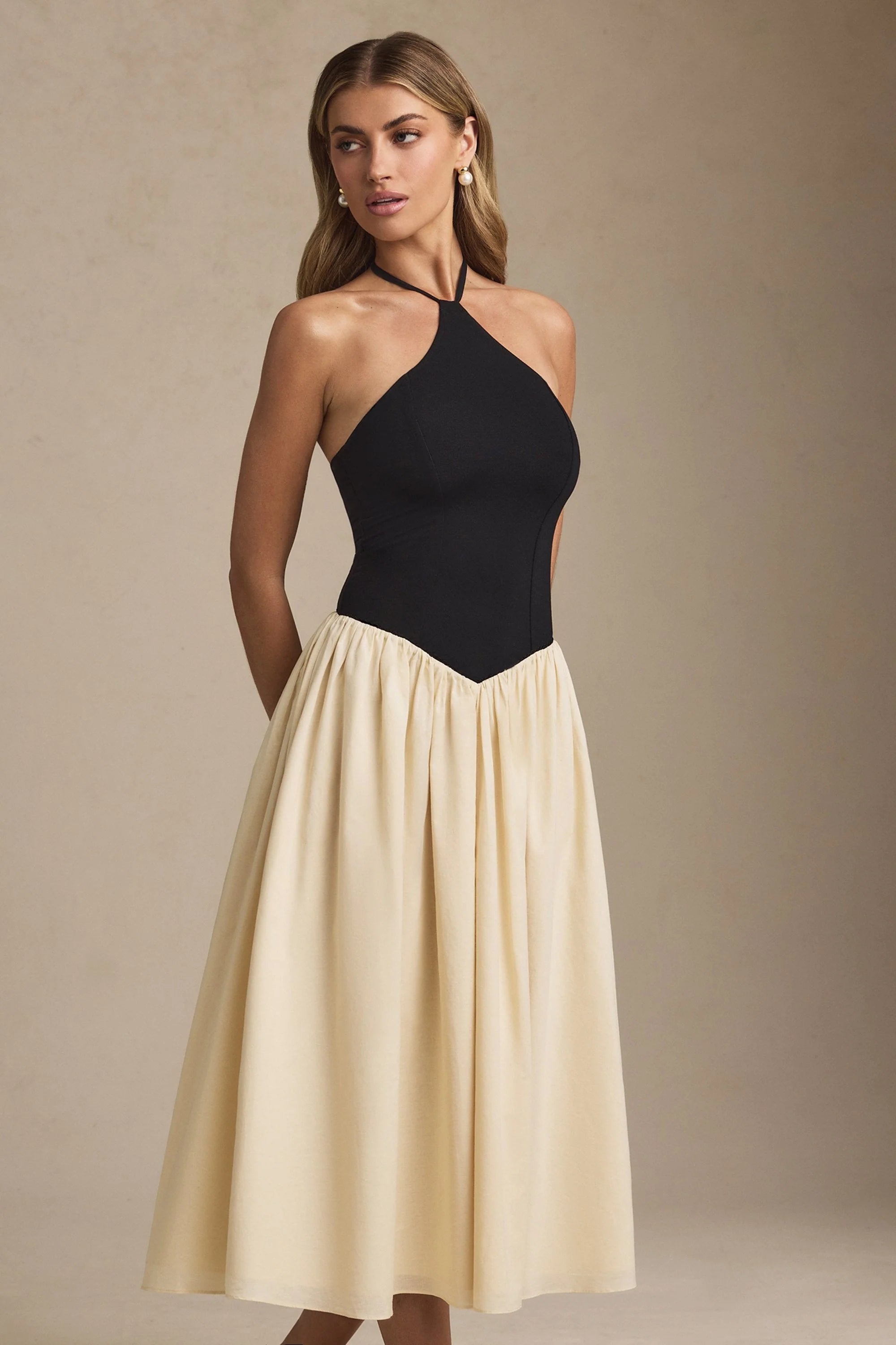 Soft contrast. Timeless and airy, the Thalira midaxi dress is a wardrobe staple you’ll love for years to come. It’s designed with a fitted halterneck bodice crafted from buttery soft stretch jersey with TENCEL™ Modal fibres, derived from controlled or certified wood sources, and features a contrasting gathered voile skirt. It’s cut to a halterneck silhouette with adjustable straps at the nape for your perfect fit.
