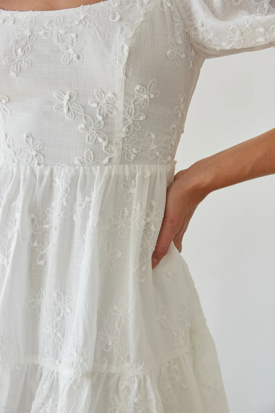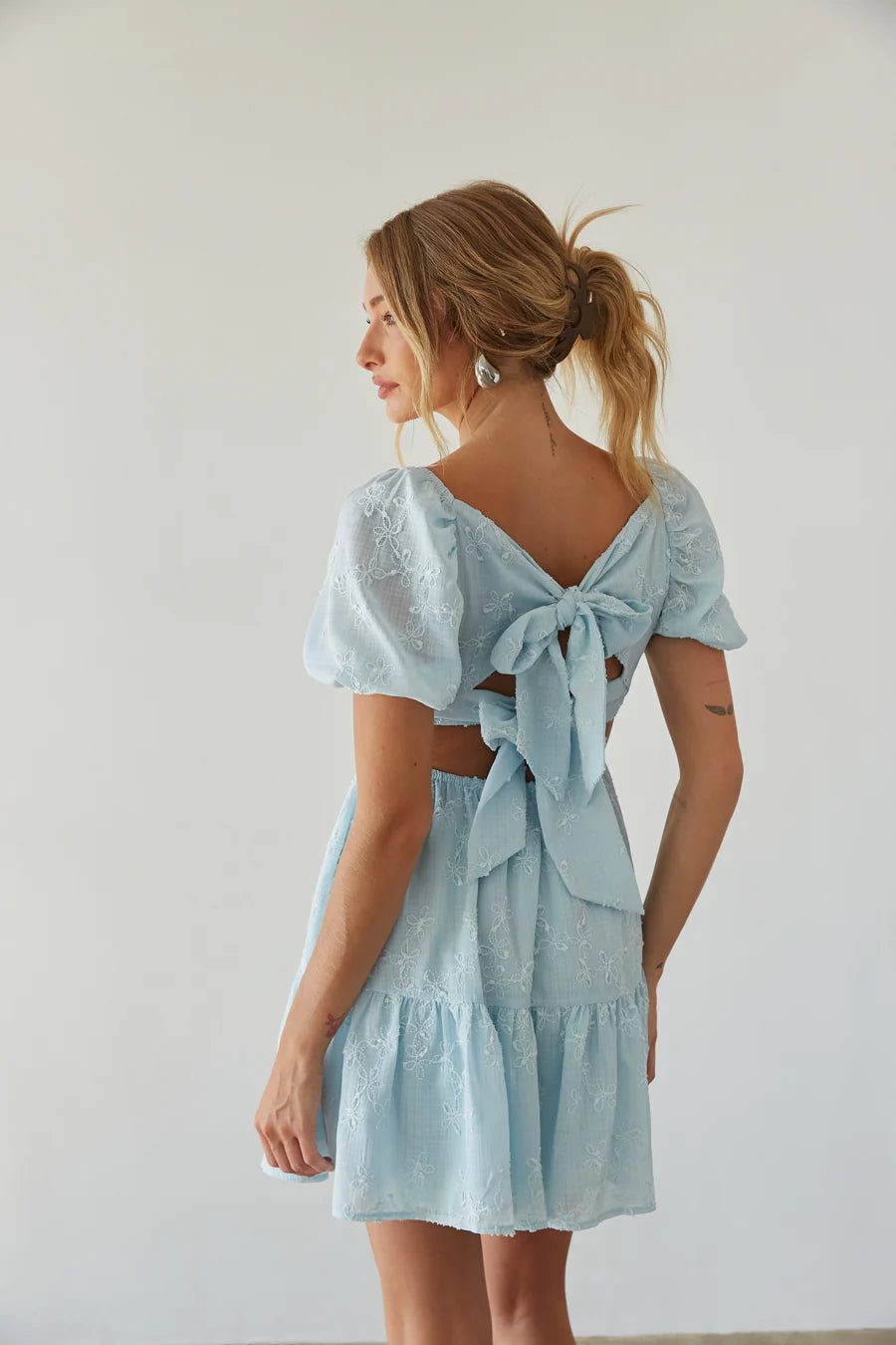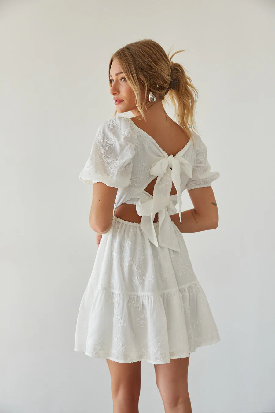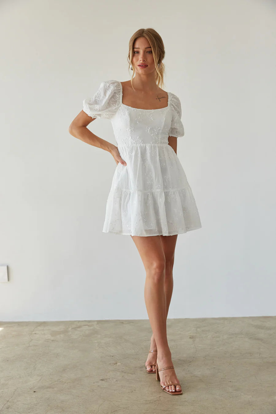 Certified sweetheart in the Hayden Puff Sleeve Babydoll Mini Dress! This darling fit and flare mini dress features puff sleeves, an open back, floral embroidery, and flowy tiered skirt. Cherry on top? This mini dress has pockets! Available in white and baby blue. Pair this summer mini dress with a chic pair of to complete the look!