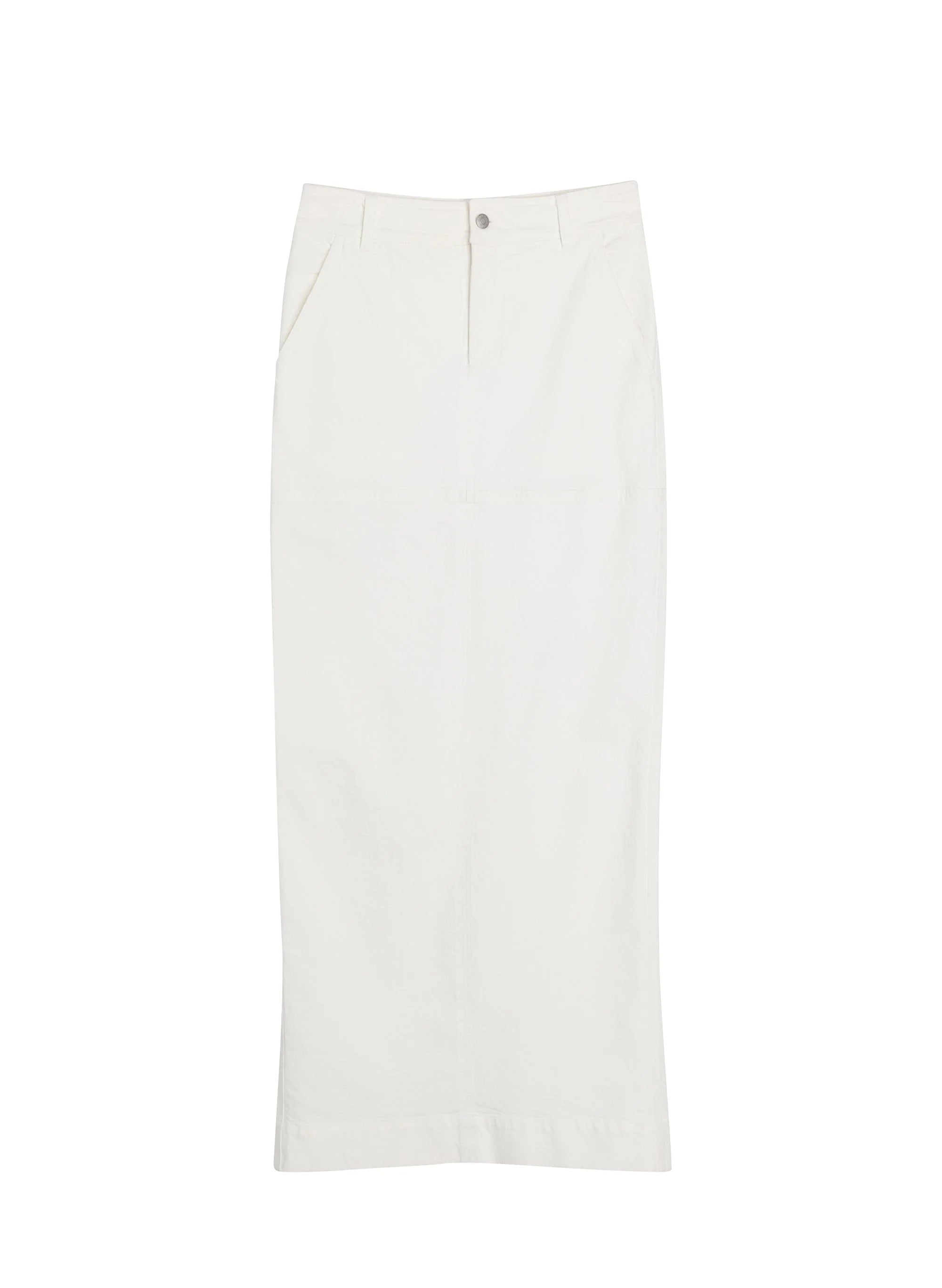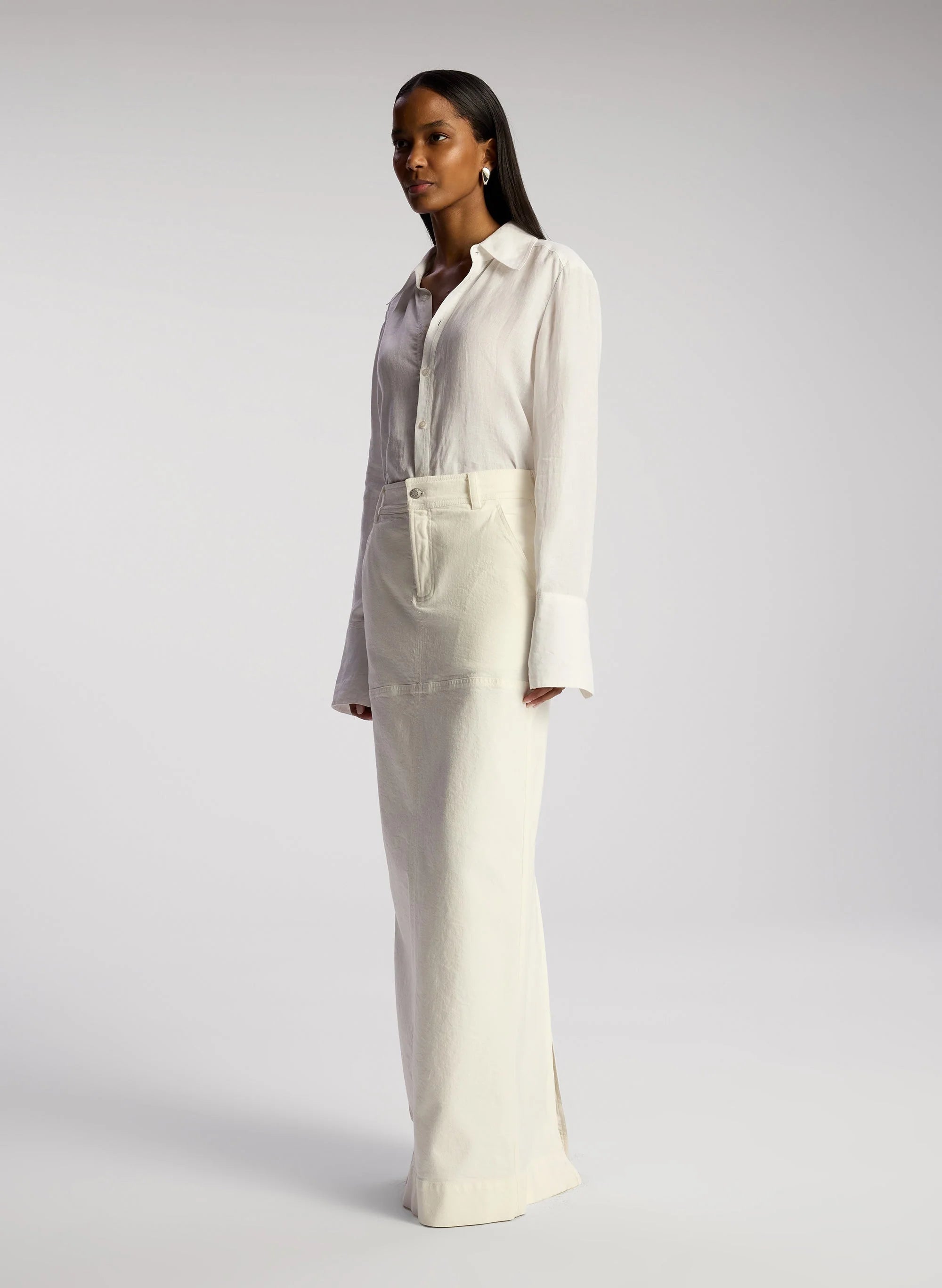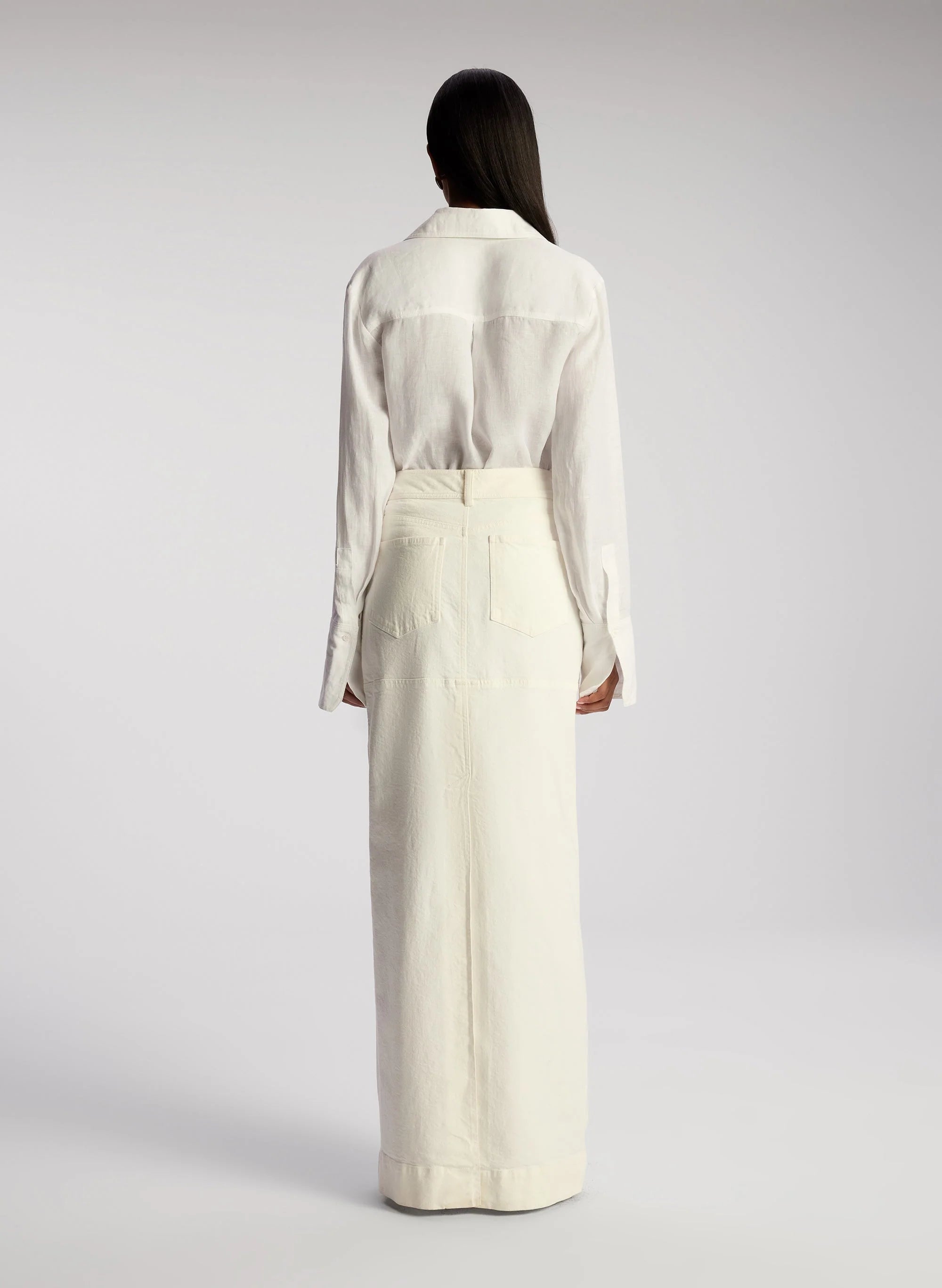 The Hunter Skirt is crafted from our overdyed stretch denim in white. This maxi column silhouette features a mid-rise waist and a black slit for effortless movement. This style runs true to size. Shop Bottoms.