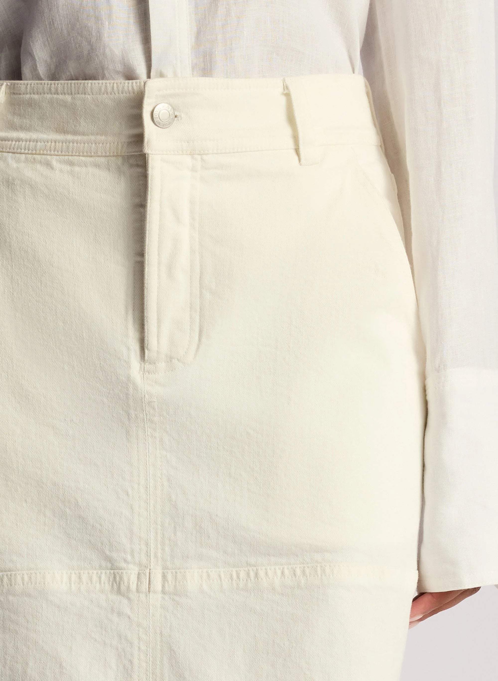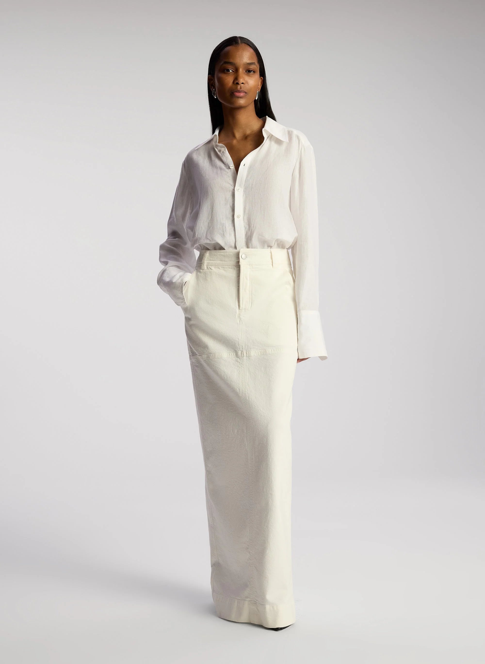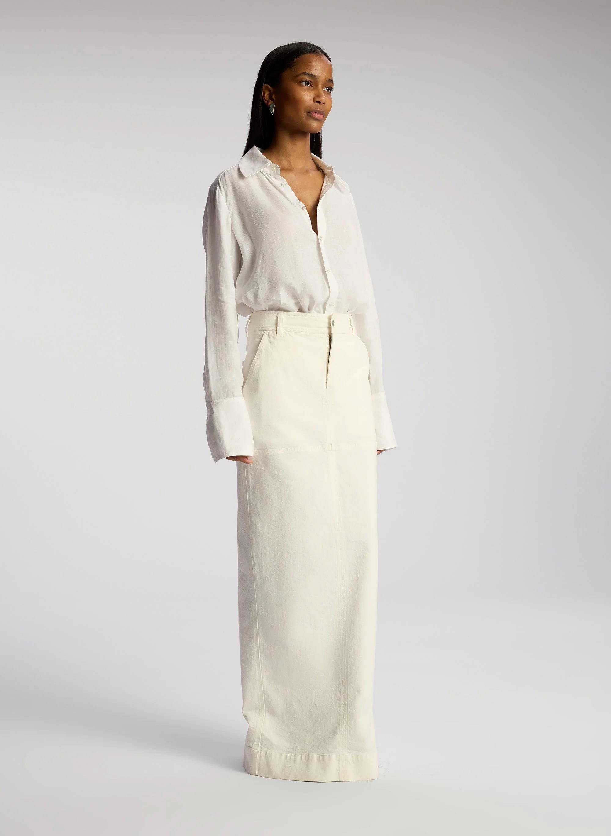 The Hunter Skirt is crafted from our overdyed stretch denim in white. This maxi column silhouette features a mid-rise waist and a black slit for effortless movement. This style runs true to size. Shop Bottoms.