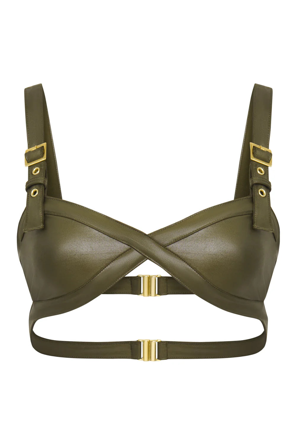 The Hydra Bikini Top is crafted from a khaki green leather look fabric and features functional buckle shoulder straps as well as a cross over panel detail with a double clasp fastening. Complete the ensemble with the matching bikini bottoms.