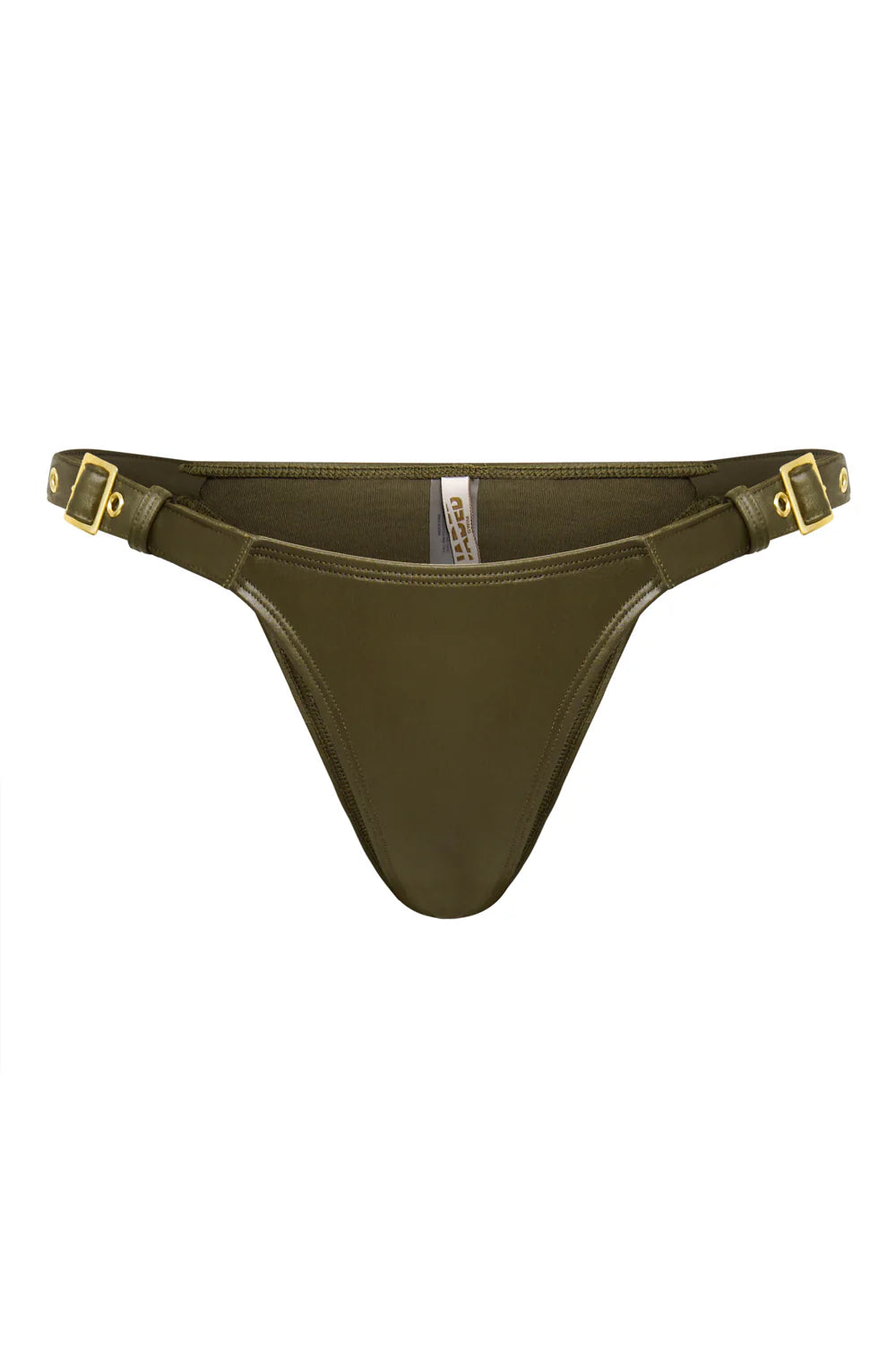 The Hydra Bikini Bottoms are crafted from a khaki green leather look fabric and feature functional buckle straps as well as a cross over panel detail. Complete the ensemble with the matching bikini top.
