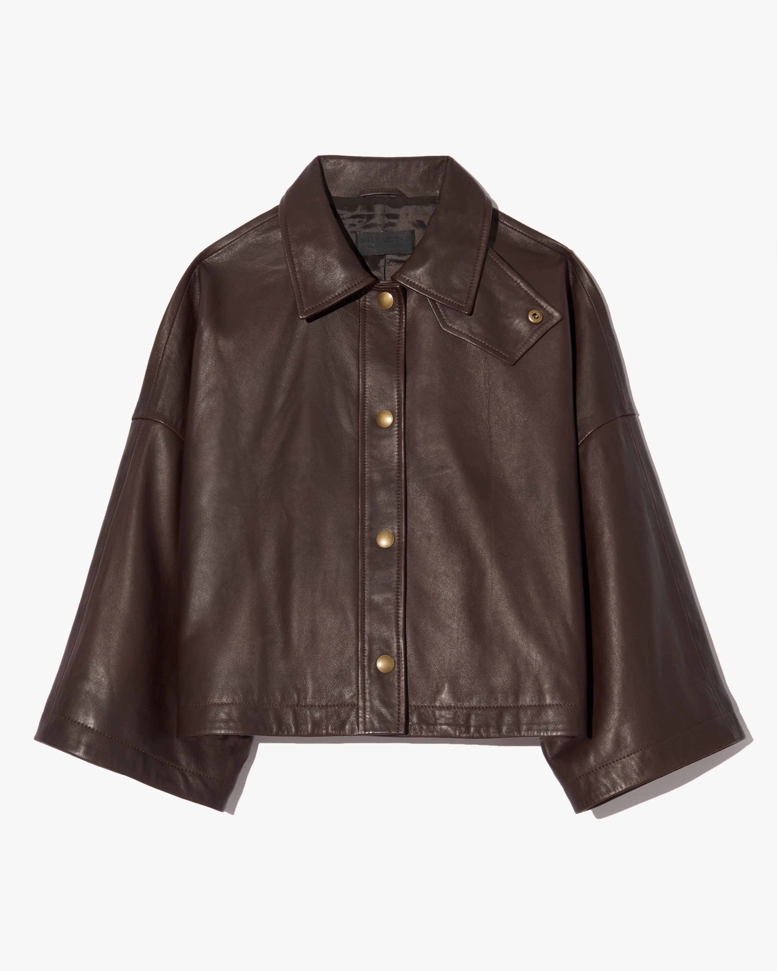 Easy relaxed jacket in Italian leather. Collar with tab neck piece. Center front buttons. No pockets. Fully lined.