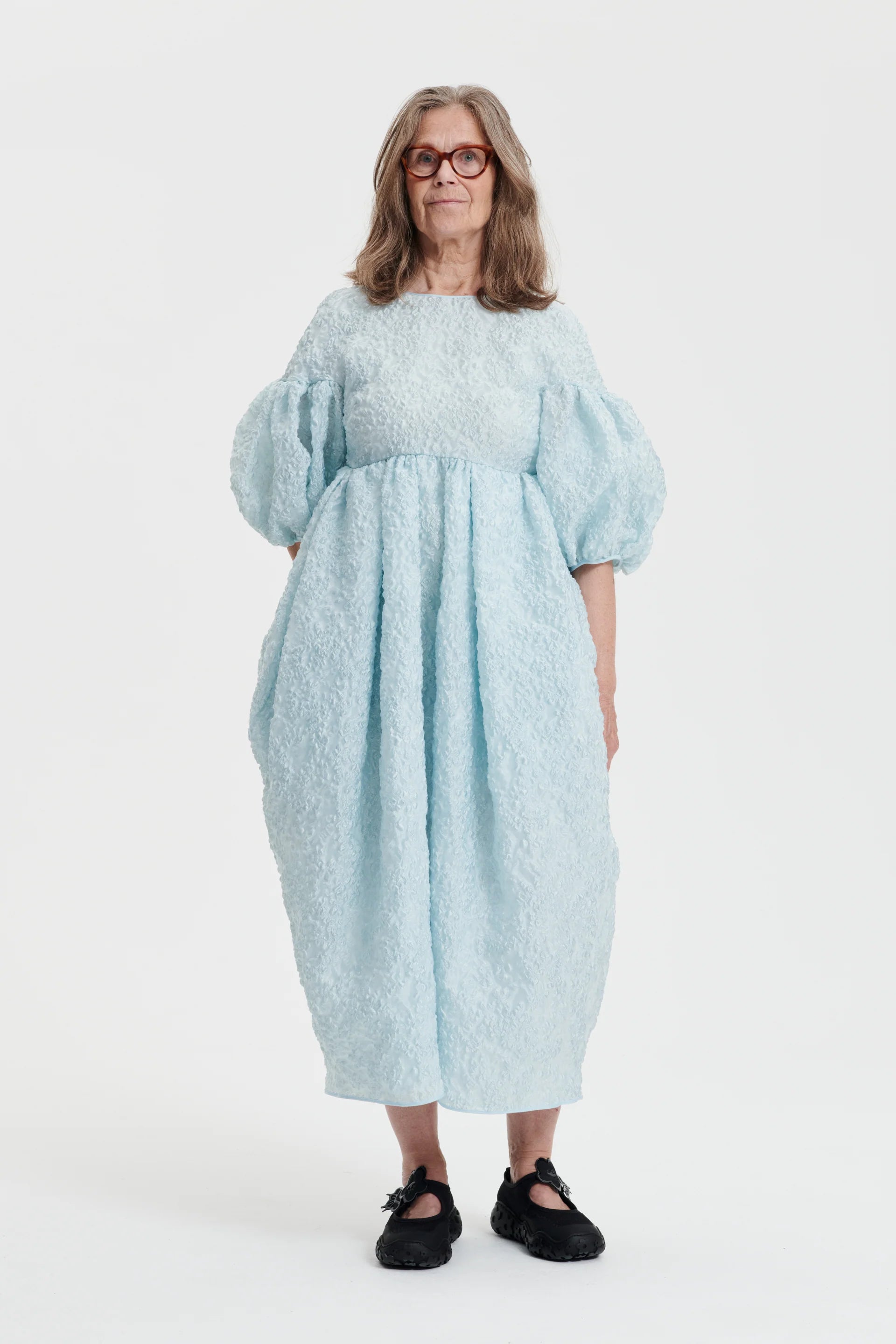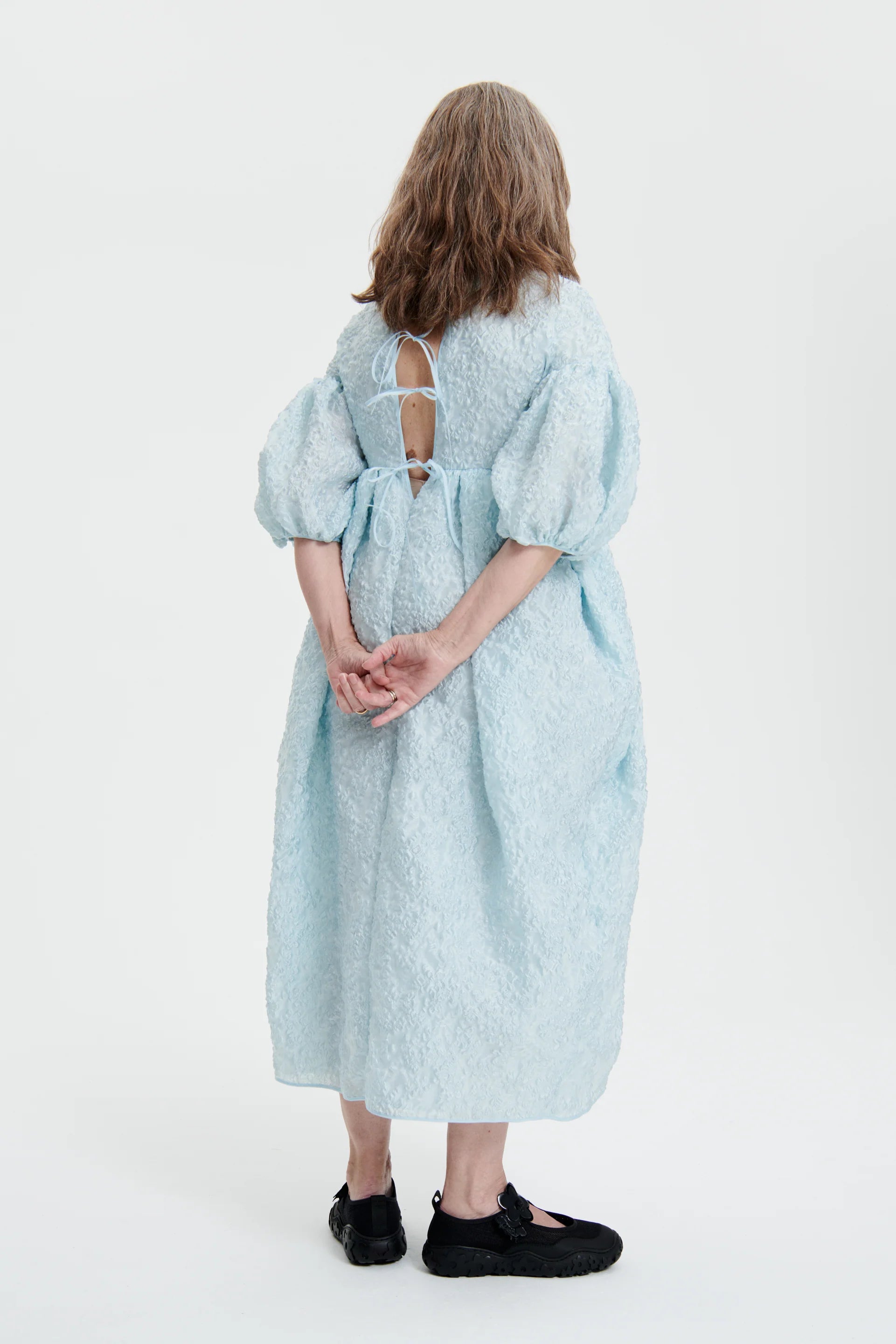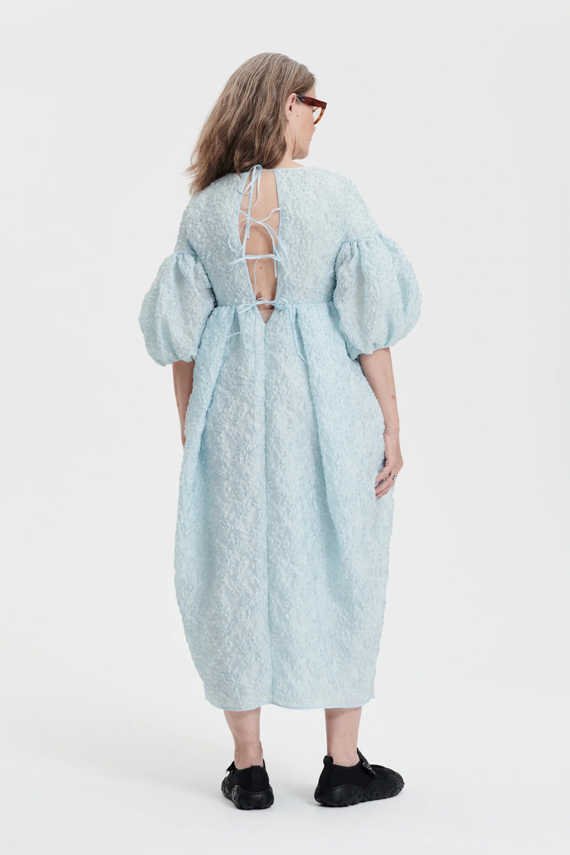 The ultra-feminine Jeanne dress is crafted in an ethereal grasmere matelassÈ. The lightweight yet elegant silhouette features a voluminous floating length. bracelet sleeves. and a tulip skirt enclosed with delicate bow ties down the back.