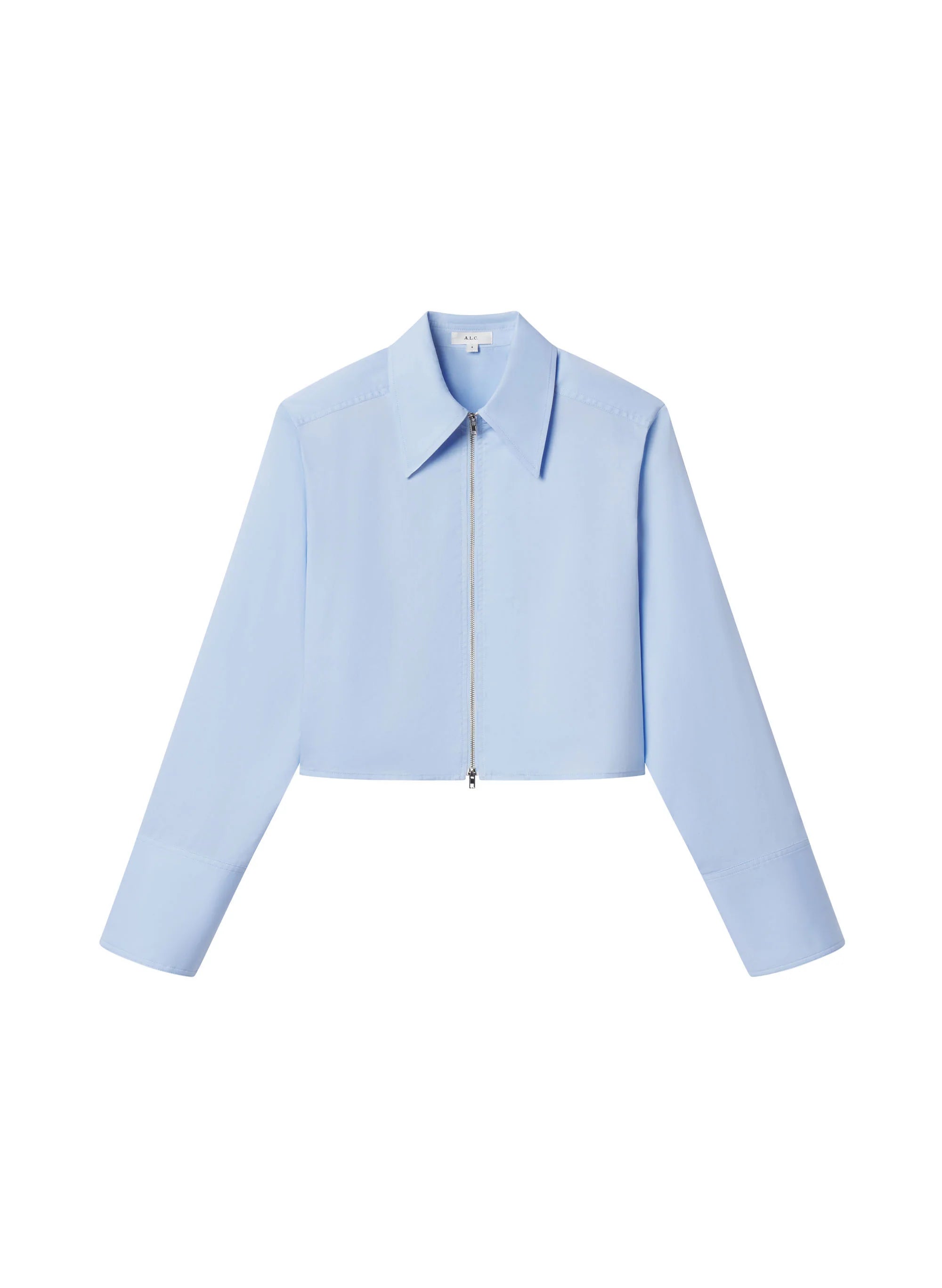 The Jill Top is crafted from airy cotton twill in a sky blue hue. This cropped silhouette features exaggerated pointed collars. a front zipper and thick knuckle-grazing cuffs. This style runs true to size. Shop Tops.