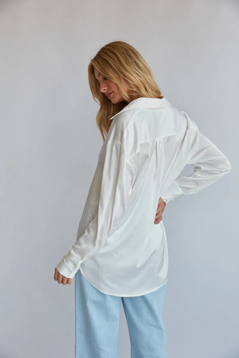 Treat yourself to a little luxury with the Jonna Satin Button Up Shirt! This top features an oversized fit, pointed collar, and double button cuffs. Pair with your favorite to finish off this cute and casual look! Size up for an oversize fit.