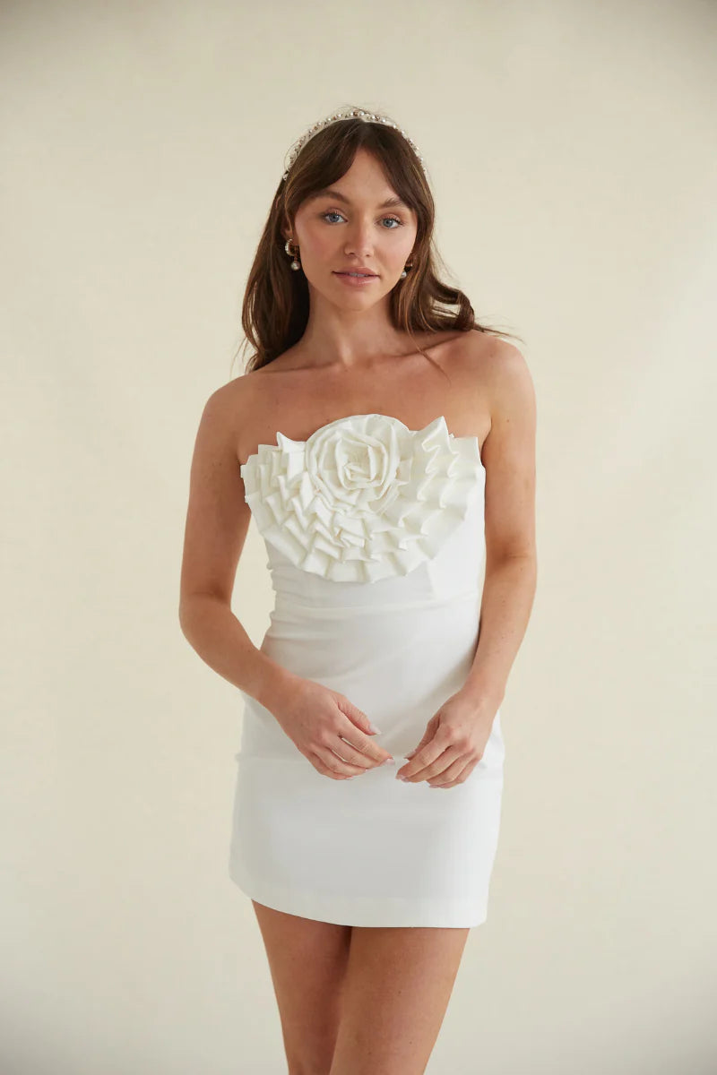 The Julianna Ruffle Rose Mini Dress is the statement piece your closet needs! This gorgeous strapless mini dress features an oversized 3D rose appliqué at the bust and a straight across neckline. Available in pink and white. Pair with a simple to complete the look!