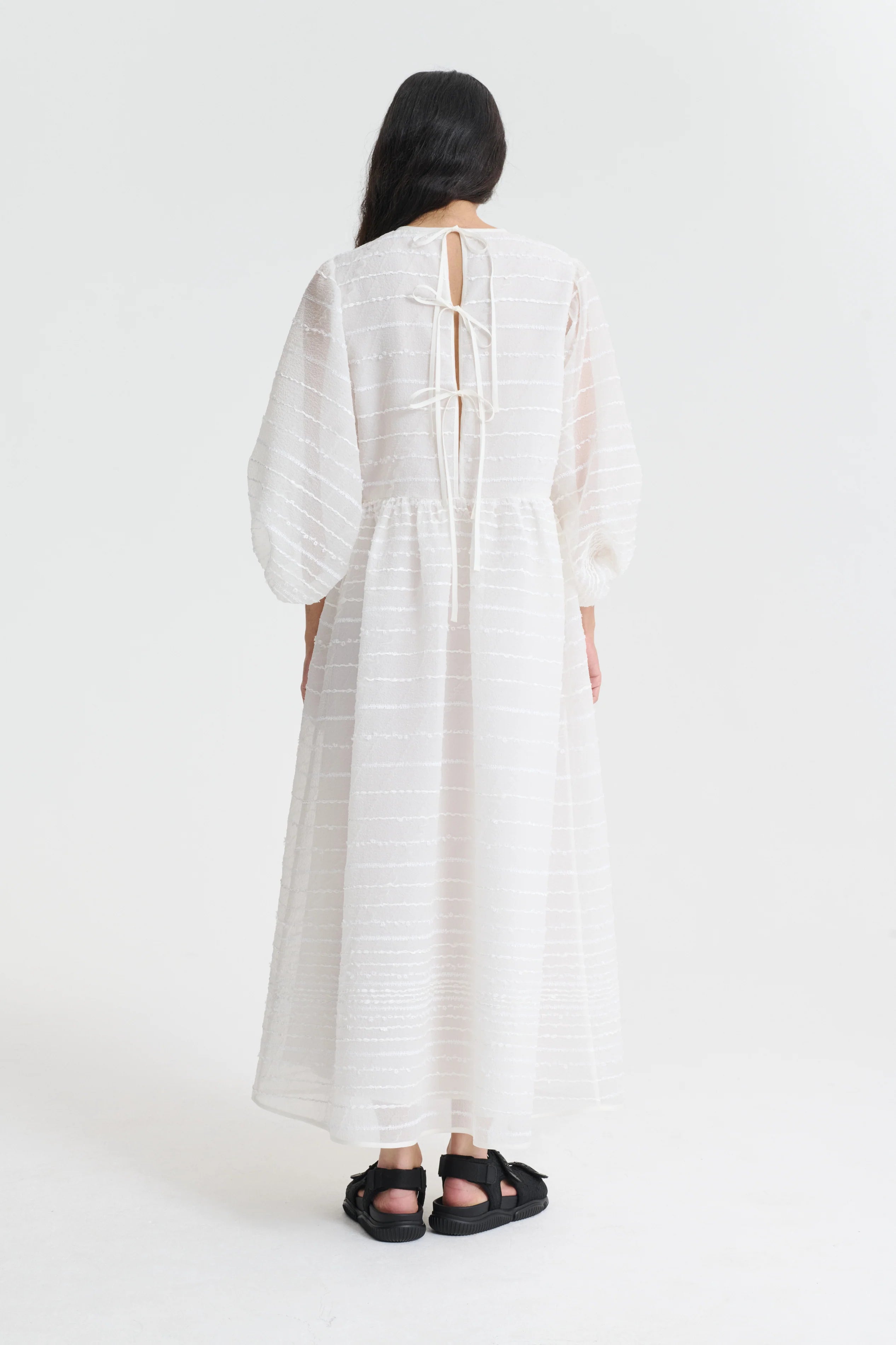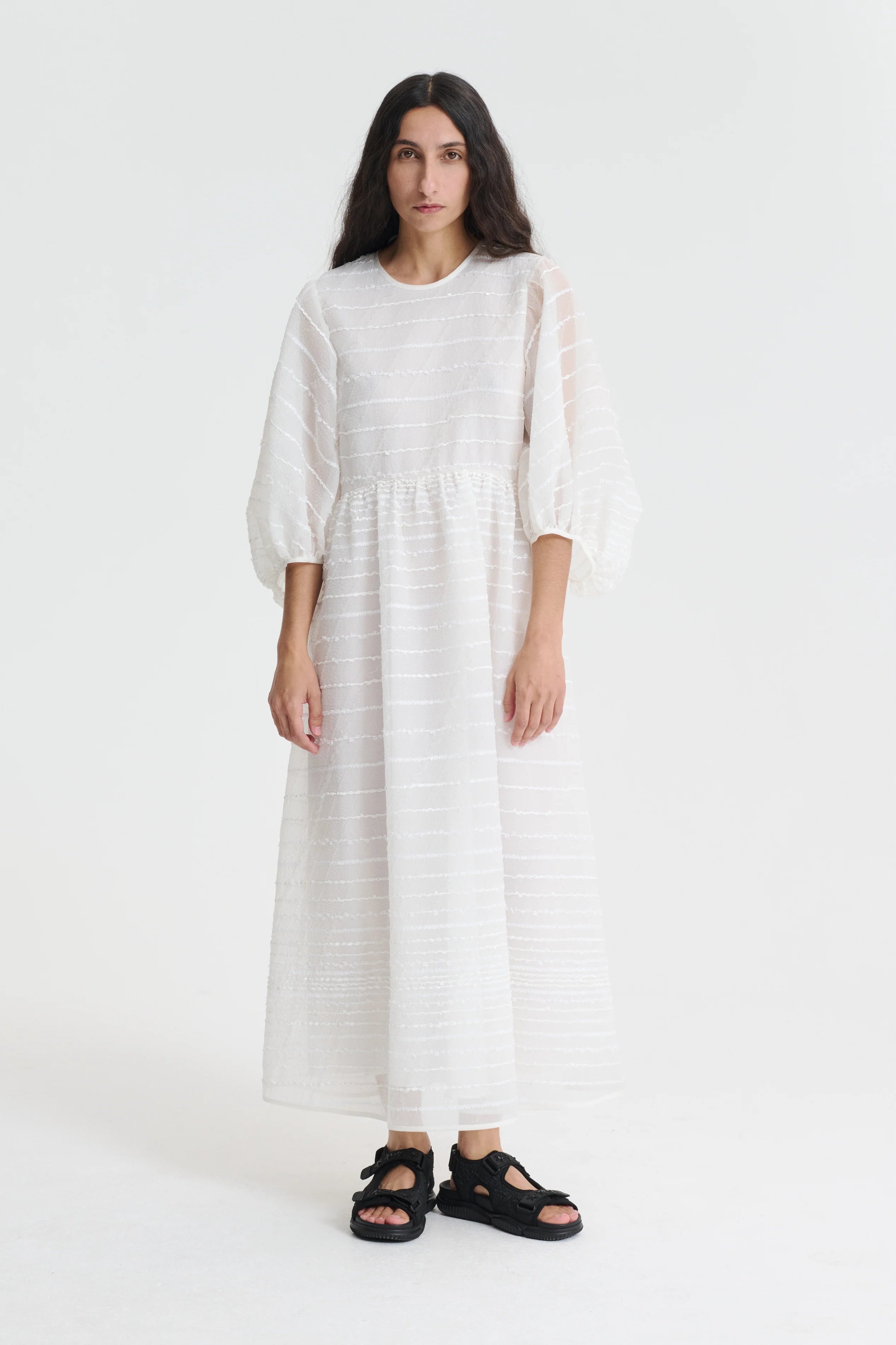 Reimagined from the archives. Cecilie Bahnsen introduces the Karmen dress in maquis jacquard. A signature silhouette with floating mid-length sleeves. a cinched waist creating understated pleating and gently dusting the ankles.