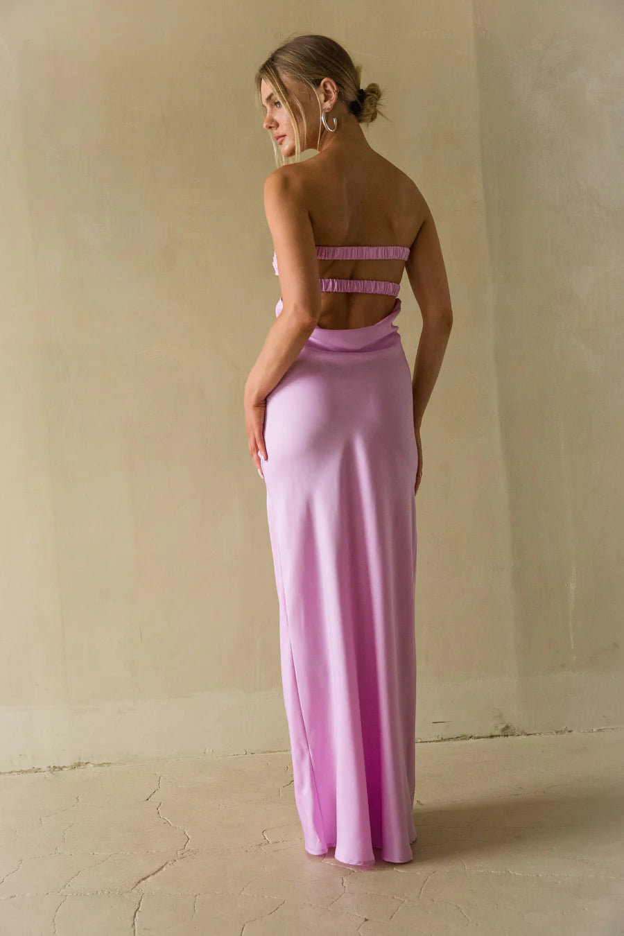 A step above your favorite mini dress, the Kira Keyhole Cutout Open Back Maxi Dress is older sister! This strapless maxi dress features a twist front pleated bust, keyhole cutout, open cowl back, and floor length slinky silhouette. Available in orchid pink and sky blue! Pair with a chic pair of to complete the look!