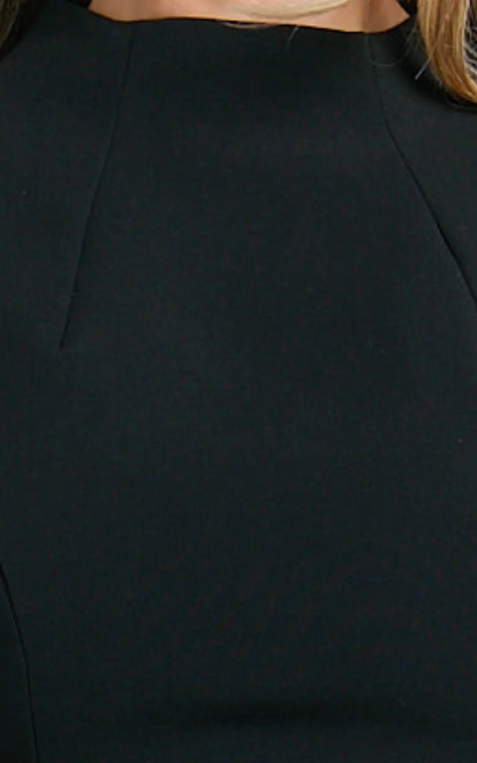 This stunning sleeveless piece features a sophisticated high neckline and an asymmetrical faux-wrap front designed to highlight your curves and flatter your figure. The playful tulip hemline adds a stylish twist, keeping your dress collection fresh and fashion-forward.