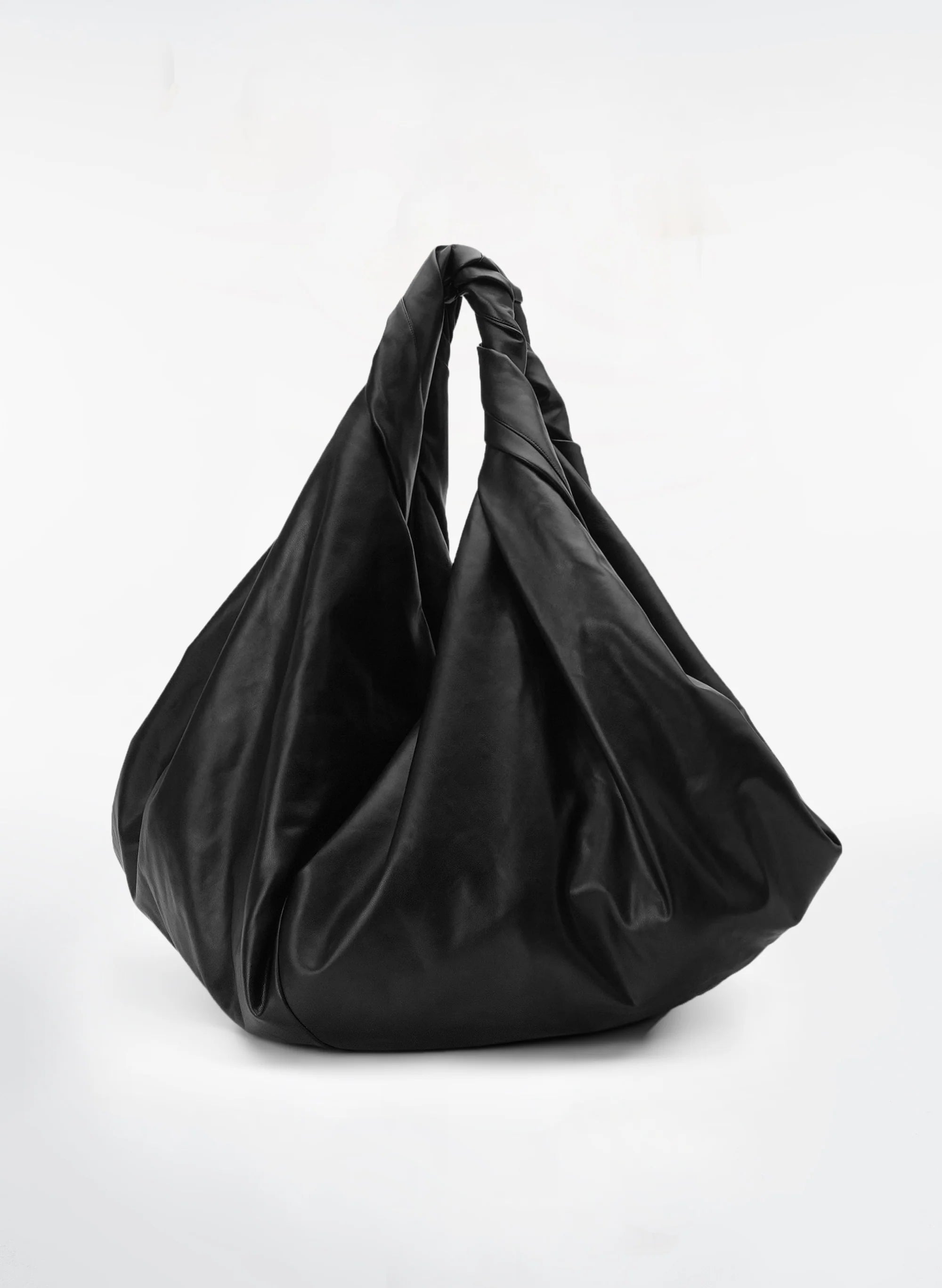 The Leo bag is crafted from buttery vegan leather and rendered in classic black. The ultra-roomy silhouette boasts wide straps and can be worn over the shoulder. or carried as an oversized clutch. Shop Bags