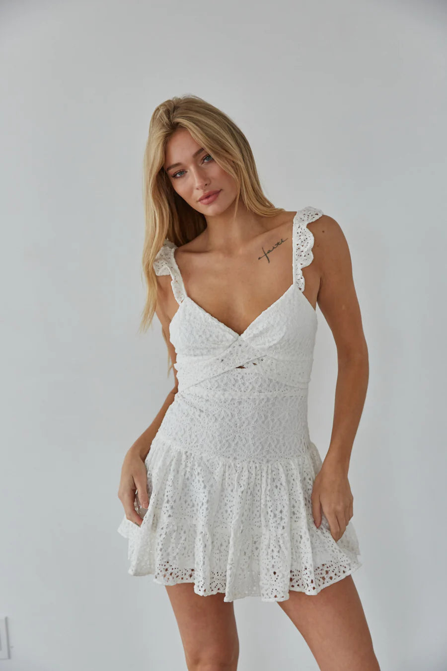 Get ready for a celebration in the Liliana Lace Mini Dress! This stunning dress features a lace design, v neckline, adjustable ruffle straps, keyhole front, and a tiered skirt. Available in white, pink, butter yellow, sky blue, and navy. Pair with your favorite to complete the look!