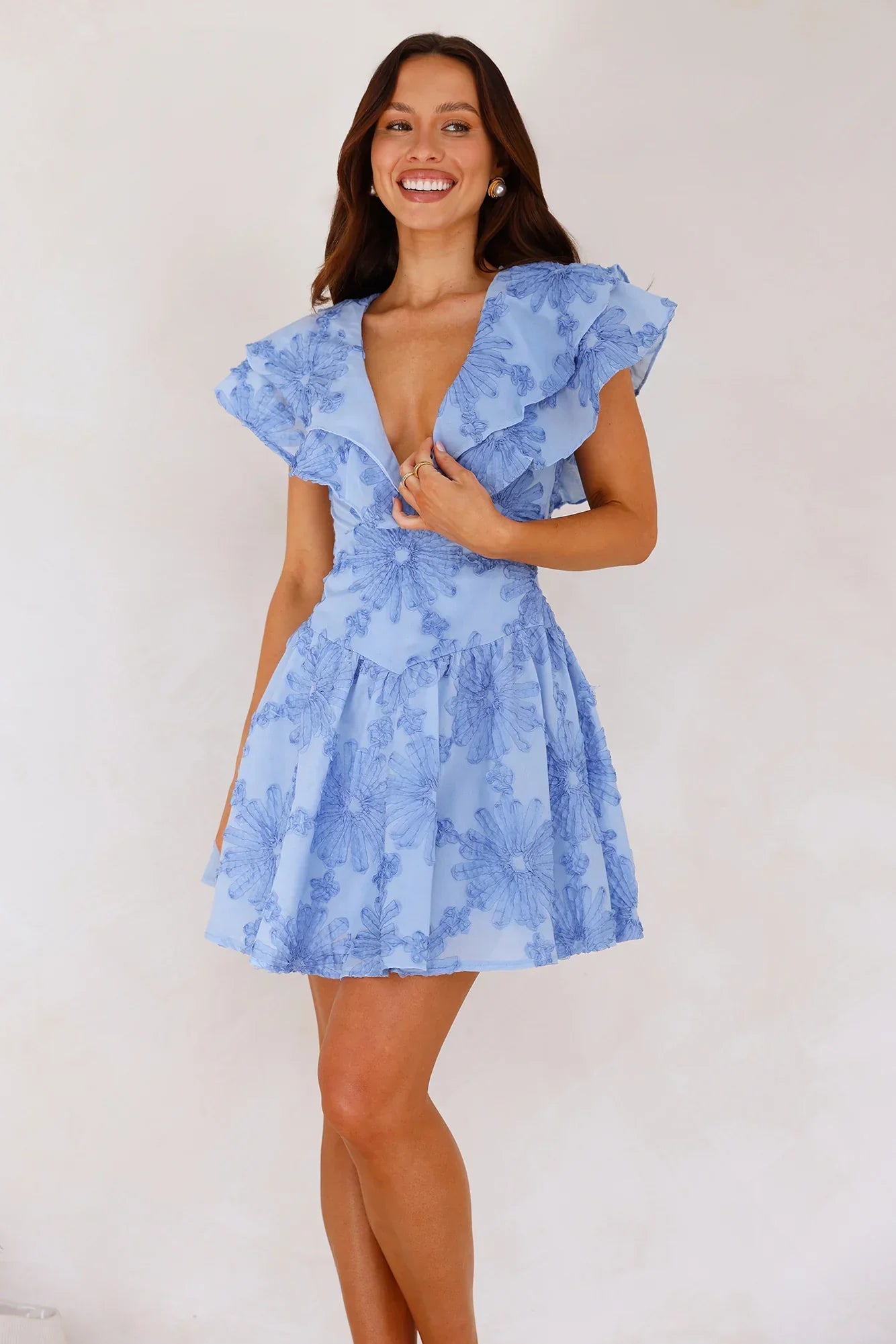 We're in love with the newest mini, the Lily's Song Mini Dress. Featuring a V-neck, frilled shoulder straps and a flowy skirt. Style with heels and curls.