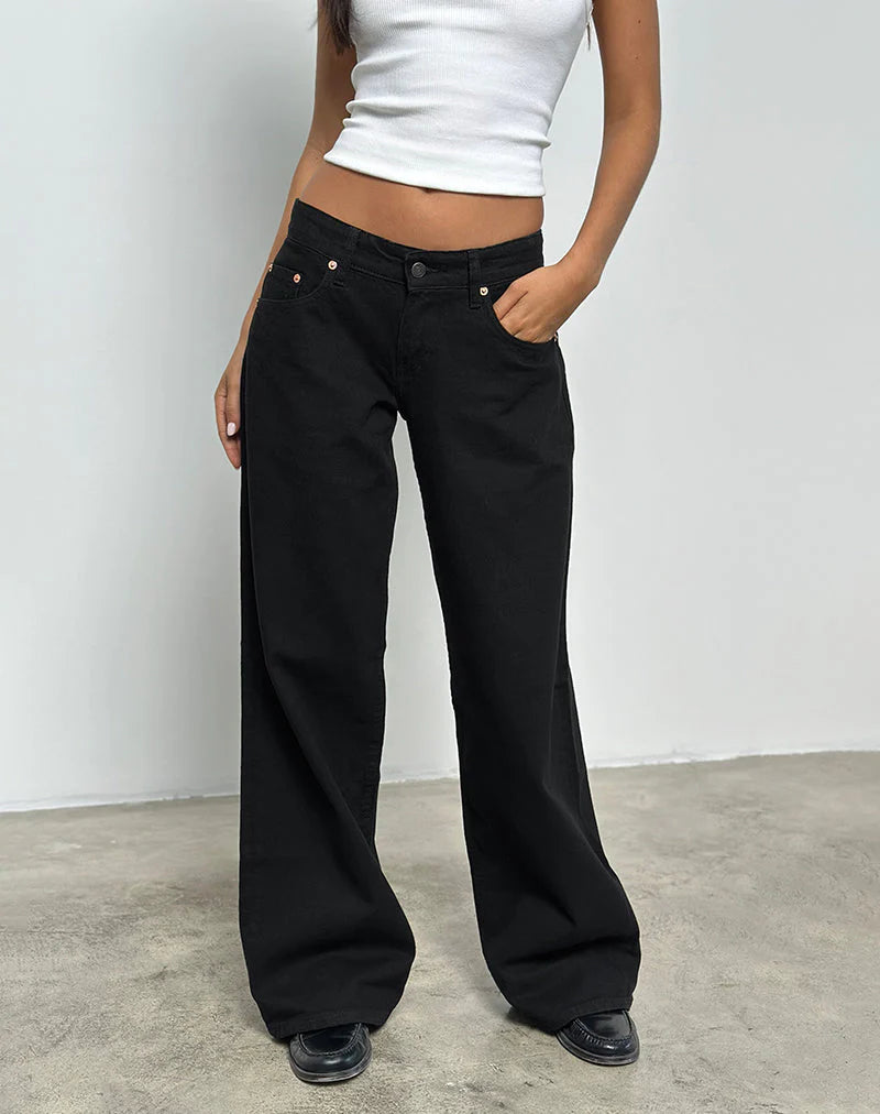 In a rinse black rigid denim, the jean boasts an oversized, fit and floor-length with a clean hem. They feature a zip and button fastening and 5 pockets, finished with a branded back tab, button and rivets. Paired with our