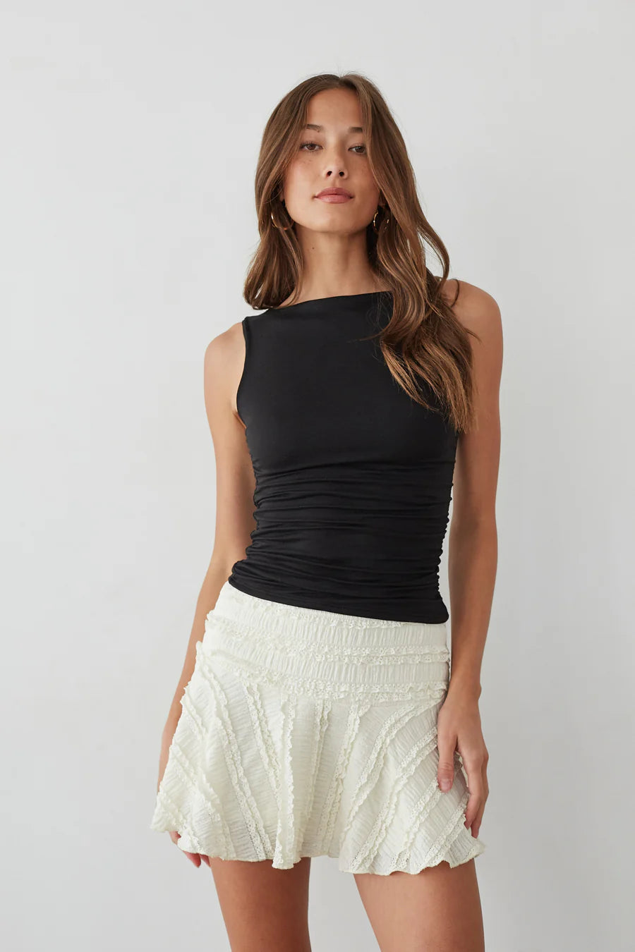 Add some flare to your outfit with the Luciana Ruffle Lace Skater Skirt. This is perfectly coquette featuring lace fabrication, mid rise waistline, and flowy silhouette. Available in Cream; style with a to complete the look!