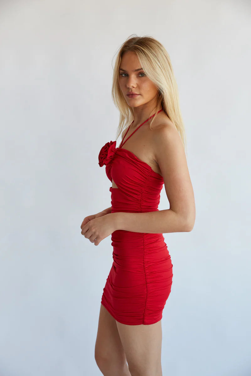 Add a touch of romance to your night out with the Madalyn Rosette Cutout Halter Bodycon Mini Dress! This stunning bodycon dress features an adjustable cinch halter neck tie with a rosette detail at the bust, a cutout, and ruching down the sides and spine. Available in red and mauve. Pair with a simple to complete the look!