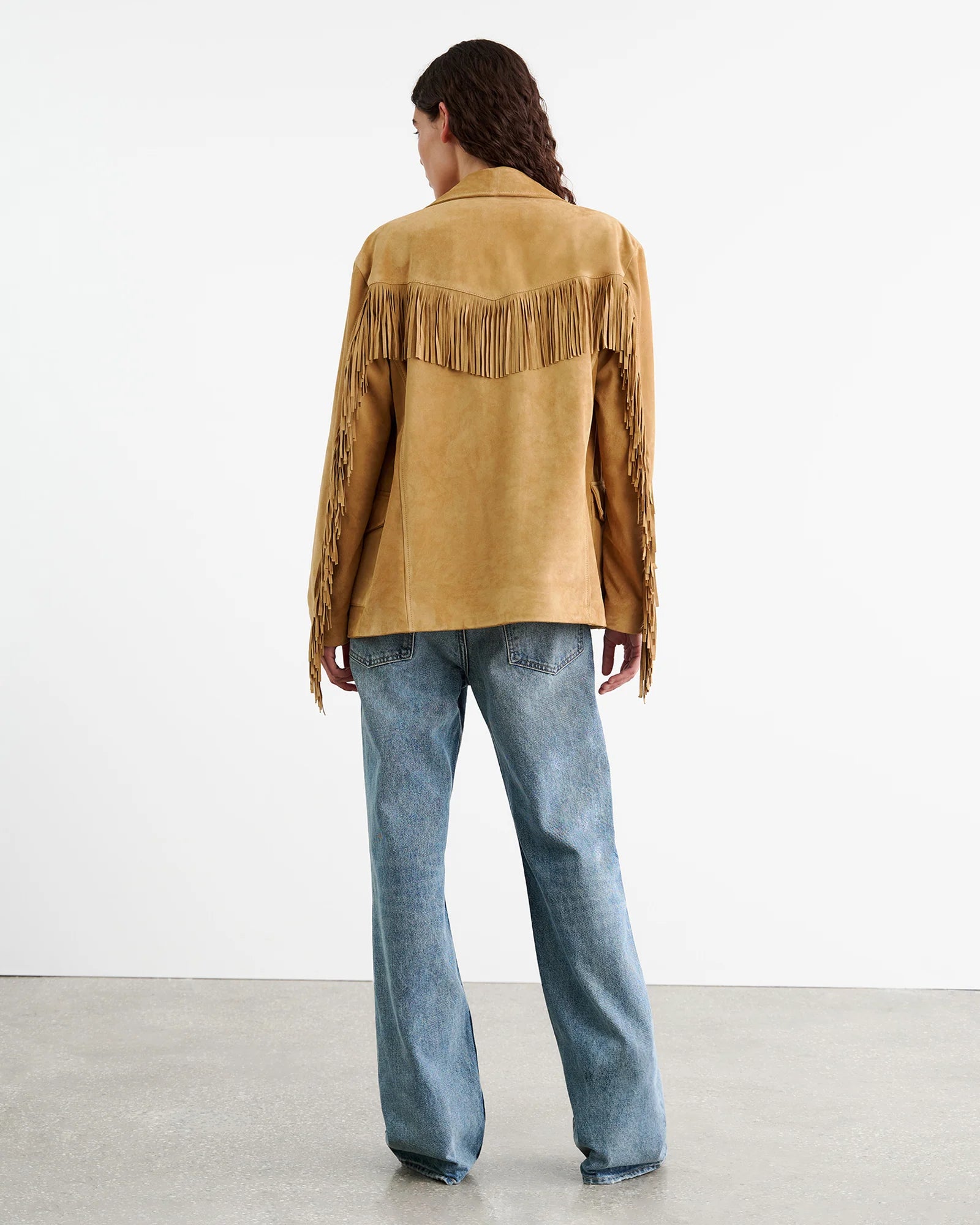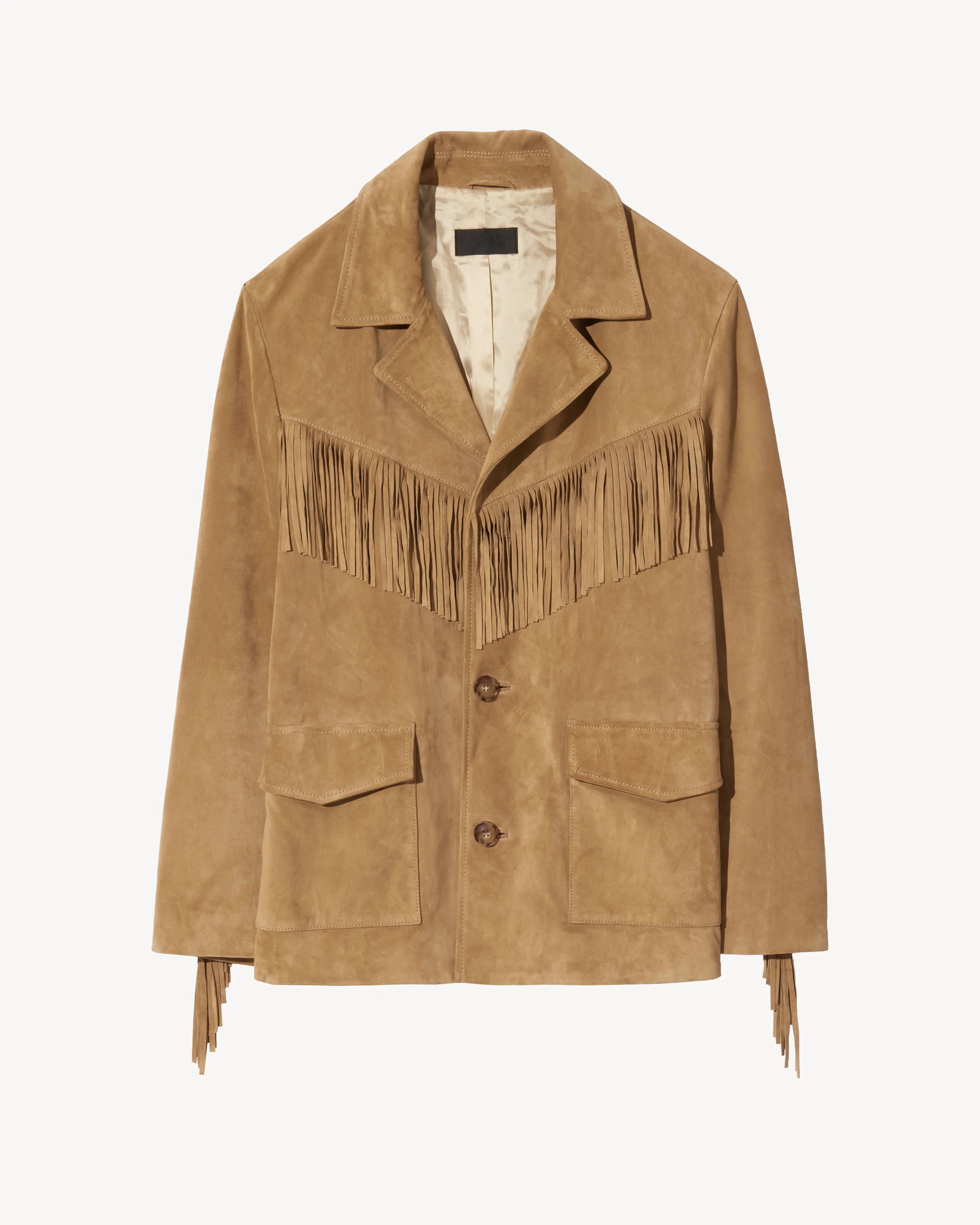 Relaxed jacket in Italian lambskin suede. Fringe detail at front and back yoke and sleeves. Patch pockets with flaps. Horn buttons at center front. Angled yoke at front and back. Center back seam detail. Leather locker loop. Fully lined.