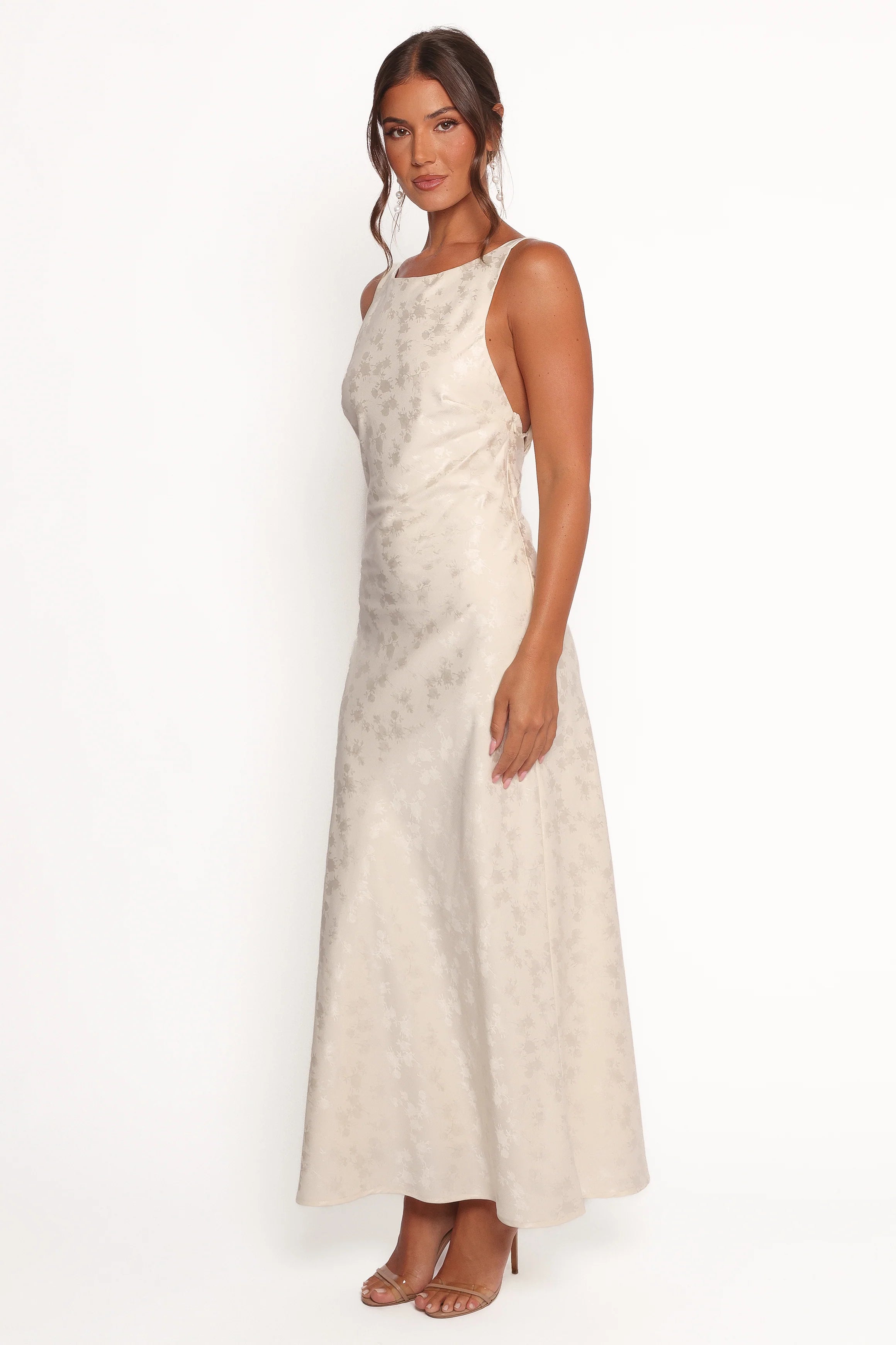DETAILS The Malie Maxi Dress in Ivory is your ultimate summer statement piece. With its breezy maxi length, round neckline, and sleeveless design, it's perfect for sun-filled days and balmy nights. The open back detail and vibrant floral print add a bold, playful touch, while the invisible side zip ensures a seamless fit.