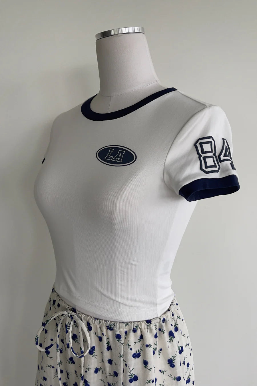 Spend Summer as a certified cool girl in the Margot LA Puff Print Baby Tee! This trendy baby tee features an LA emblem and 84 sleeve detail. With navy trim accents and a snug cropped fit, this baby tee is super versatile! Pair this baby tee with the to complete the outfit!